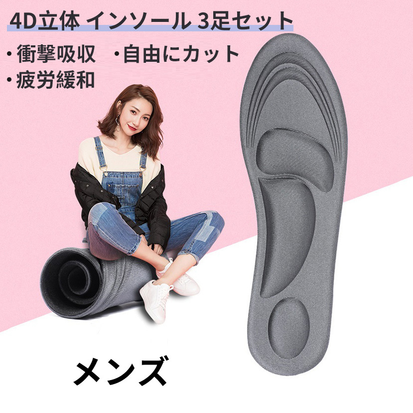 ★インソール 3足セット 立体 4D 偏平足 中敷き なかじき 靴 スニーカー シューズ アーチサポート 衝撃吸収 立ち仕事 足裏 メンズ グレー