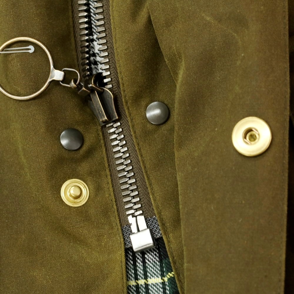 まるでバブアーのビデイルジャケットを思わせるオイルド系のコットンを用いたフィールドジャケットです。フィールドジャケットの袖を取り外し、裏地だけ残したような凝ったデザインがマルジェラならではの存在感。コーデュロイの襟や背面のゲームポケット等、ハンティングジャケットのディテールを上手くモードな雰囲気に落とし込んだ一着です。