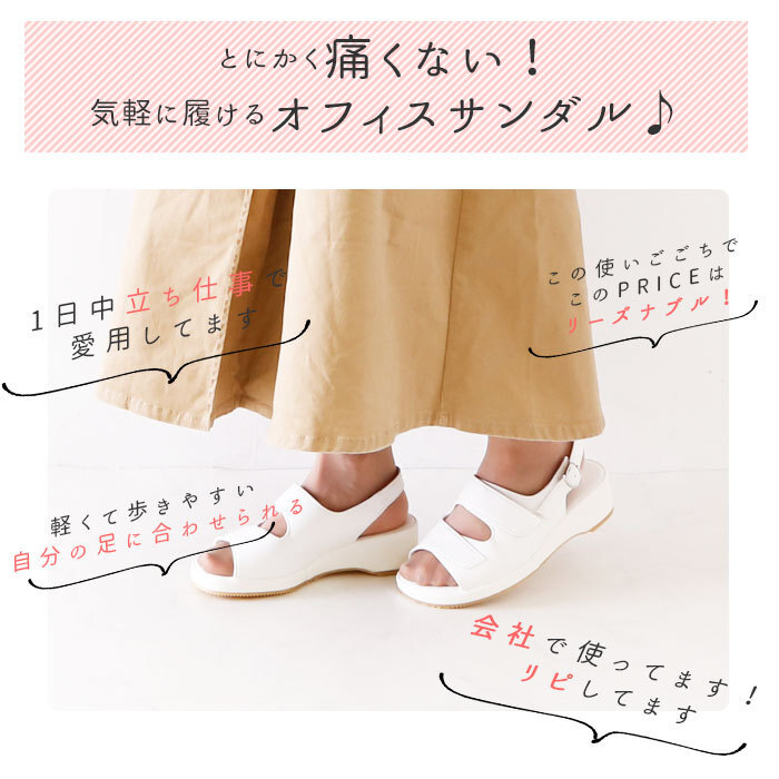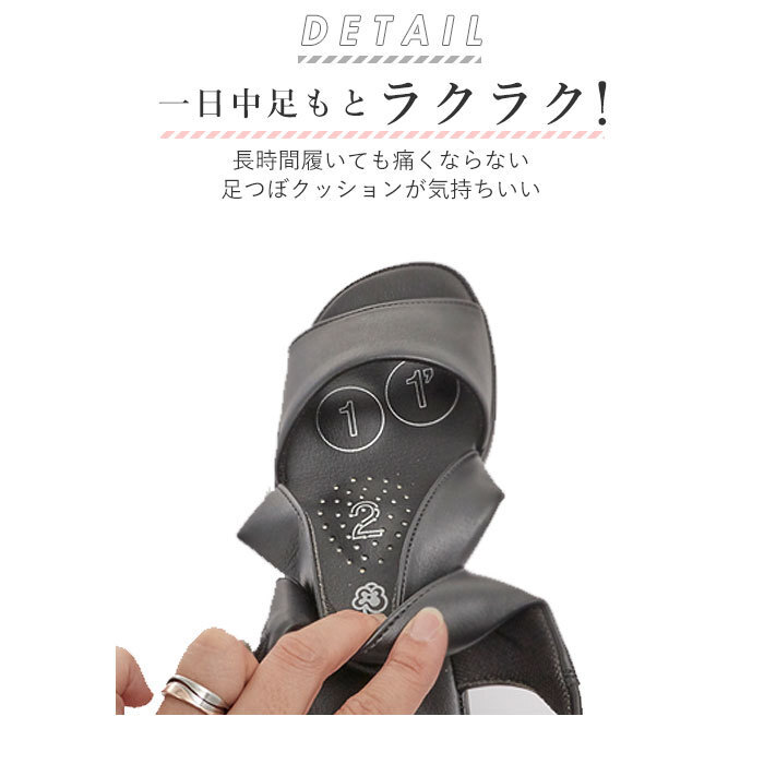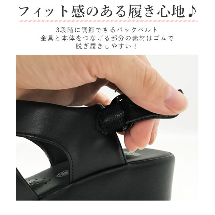 | 商品説明 | 足に当たる部分は吸水性に優れたメッシュ生地。ゴム付きベルトで足にフィットします。 安定感のあるカカトには衝撃を和らげる木芯入りで、疲れを軽減してくれます。 |