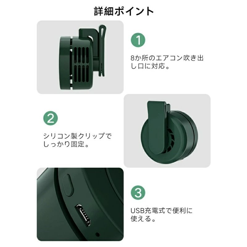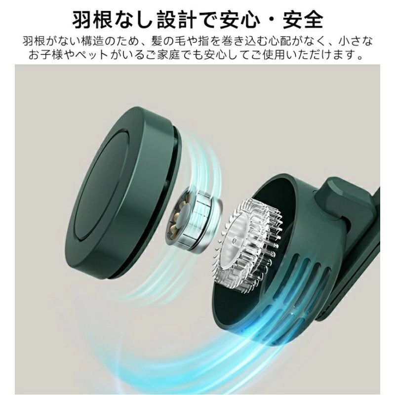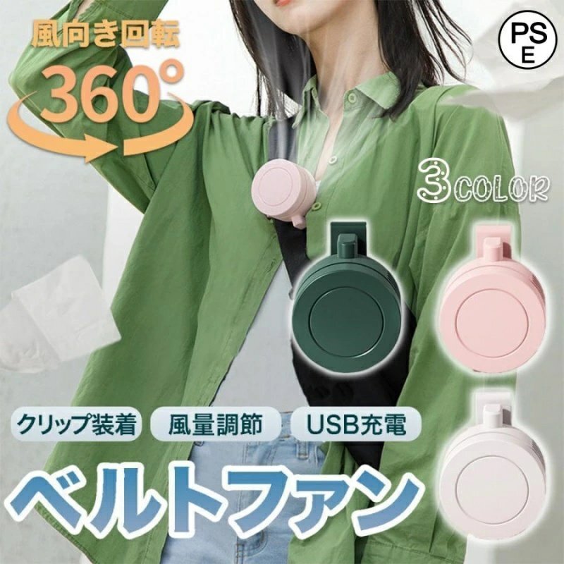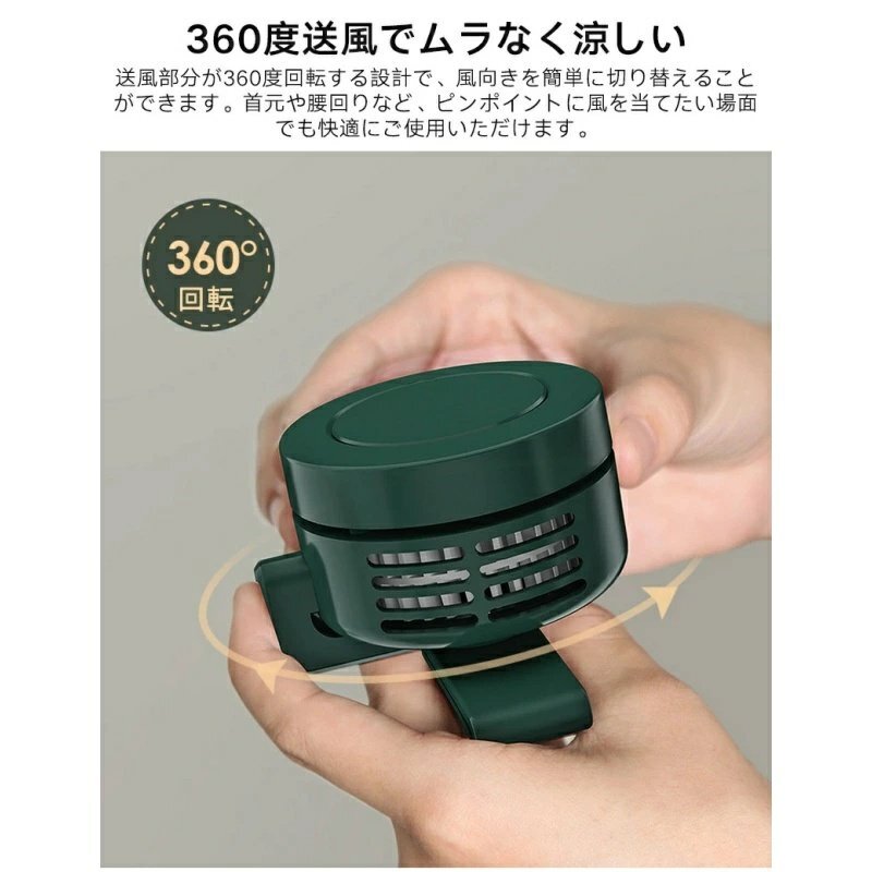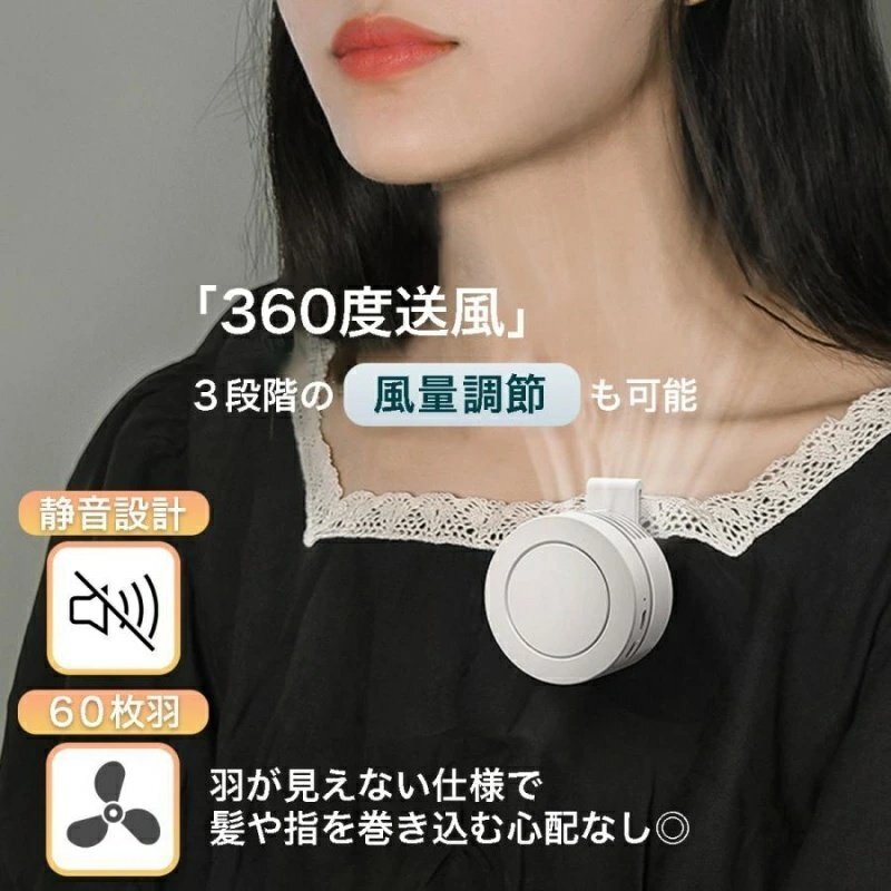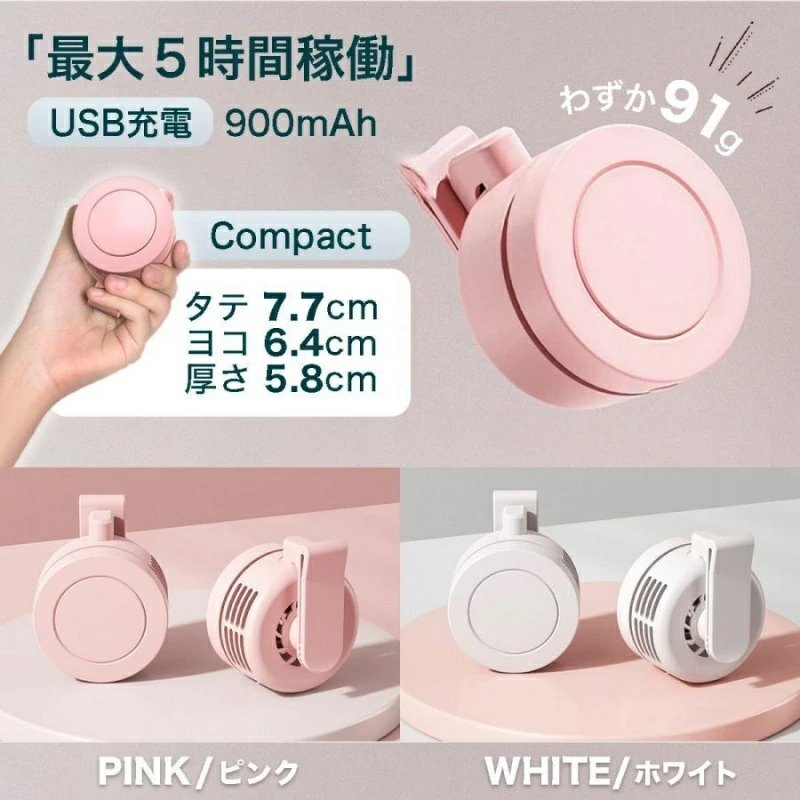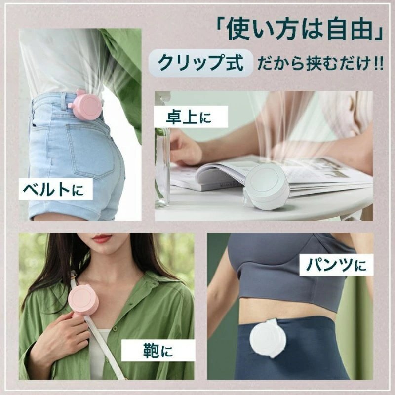 ■おすすめポイント:コンパクトで超軽量 DCモーターを採用で低消耗、低騒音 クリップ型で、バッグや、襟、ウエストに付けてハンズフリー  手動で送風方向を360度調整し、卓上型に変身  羽なしなので、髪の長い方でも心配なく使用できる。