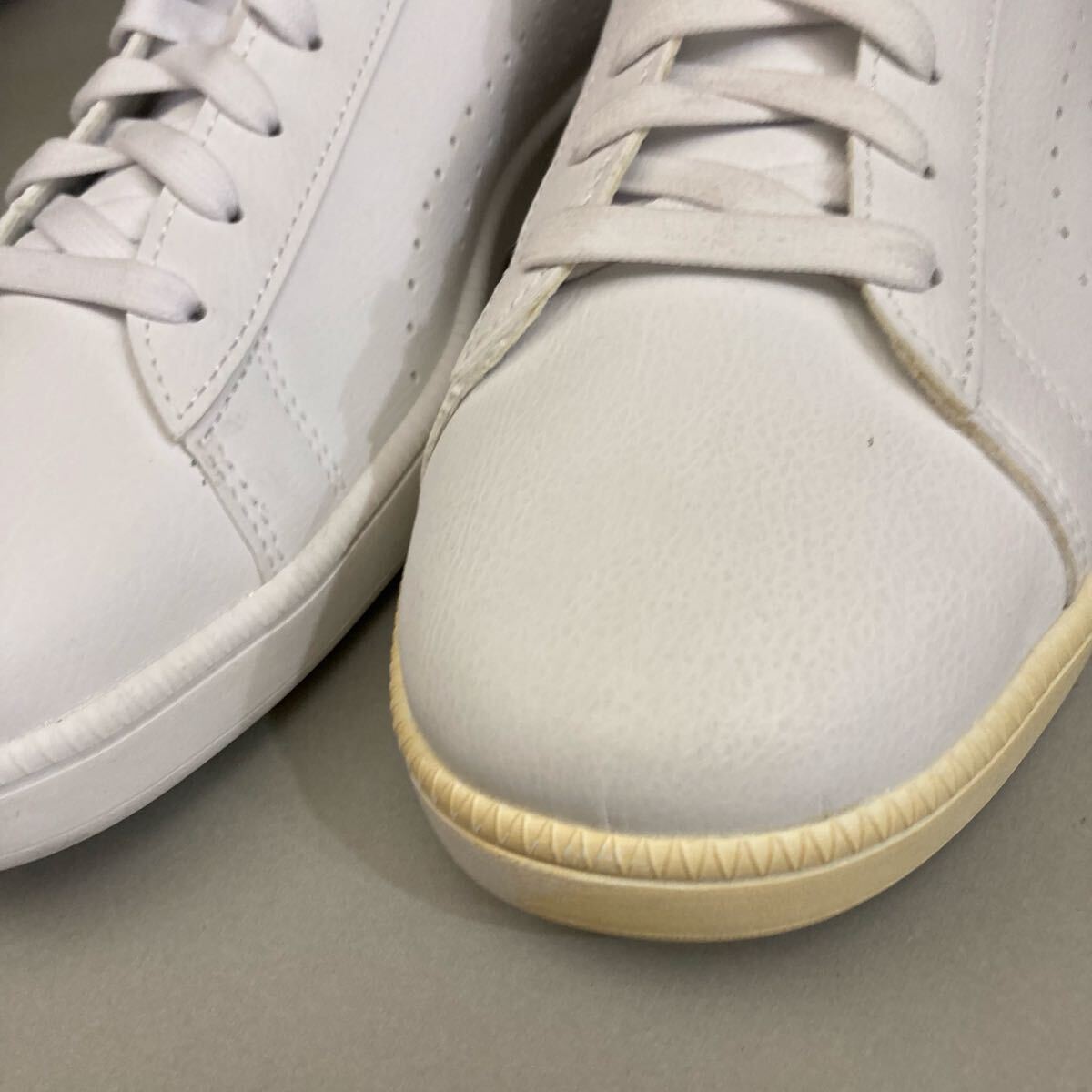 新品未使用品です。良品です。左足つま先部分に日焼け、黄ばみがあります。側面に多少のスレがあります。まだまだ履けるお品です。