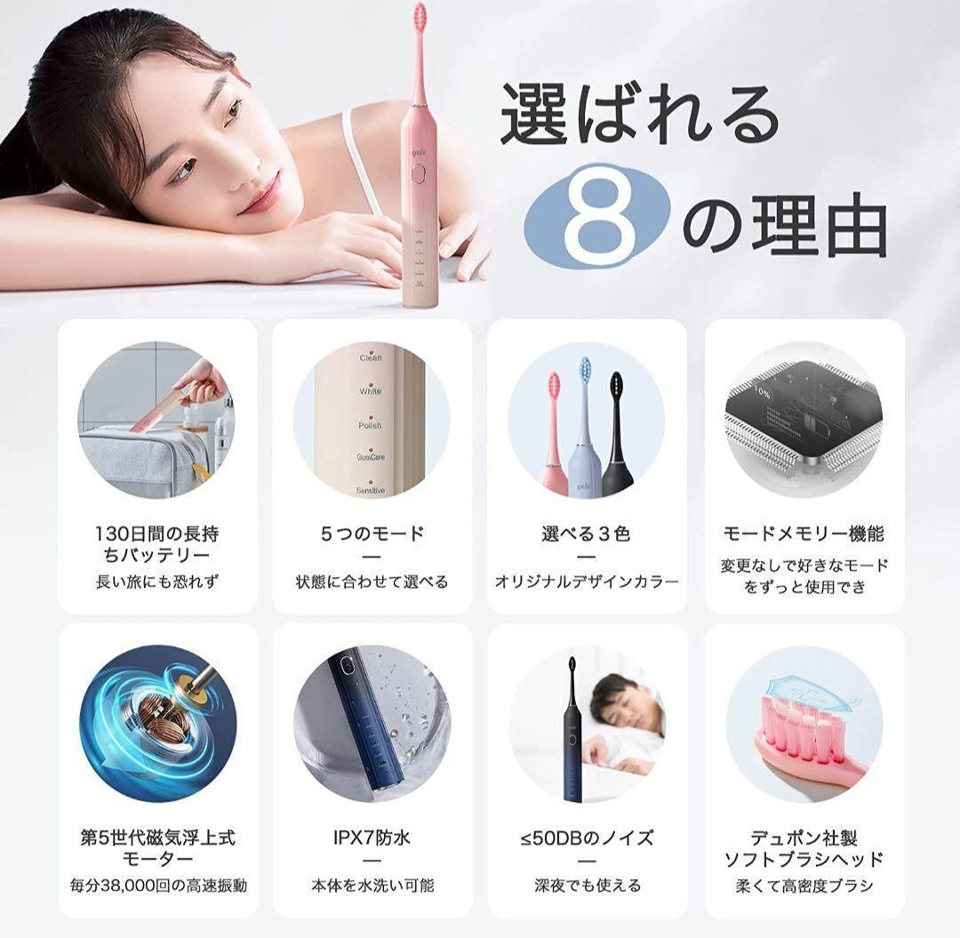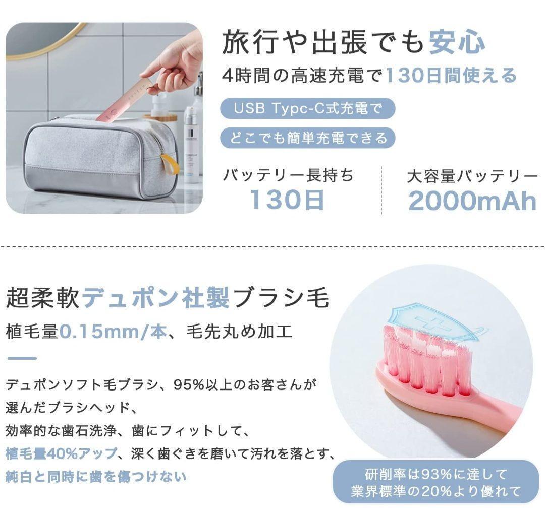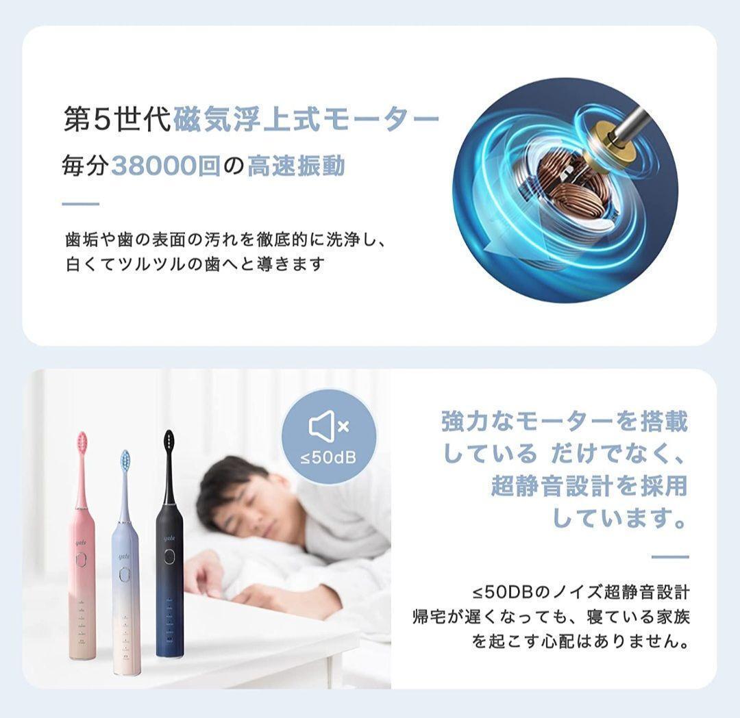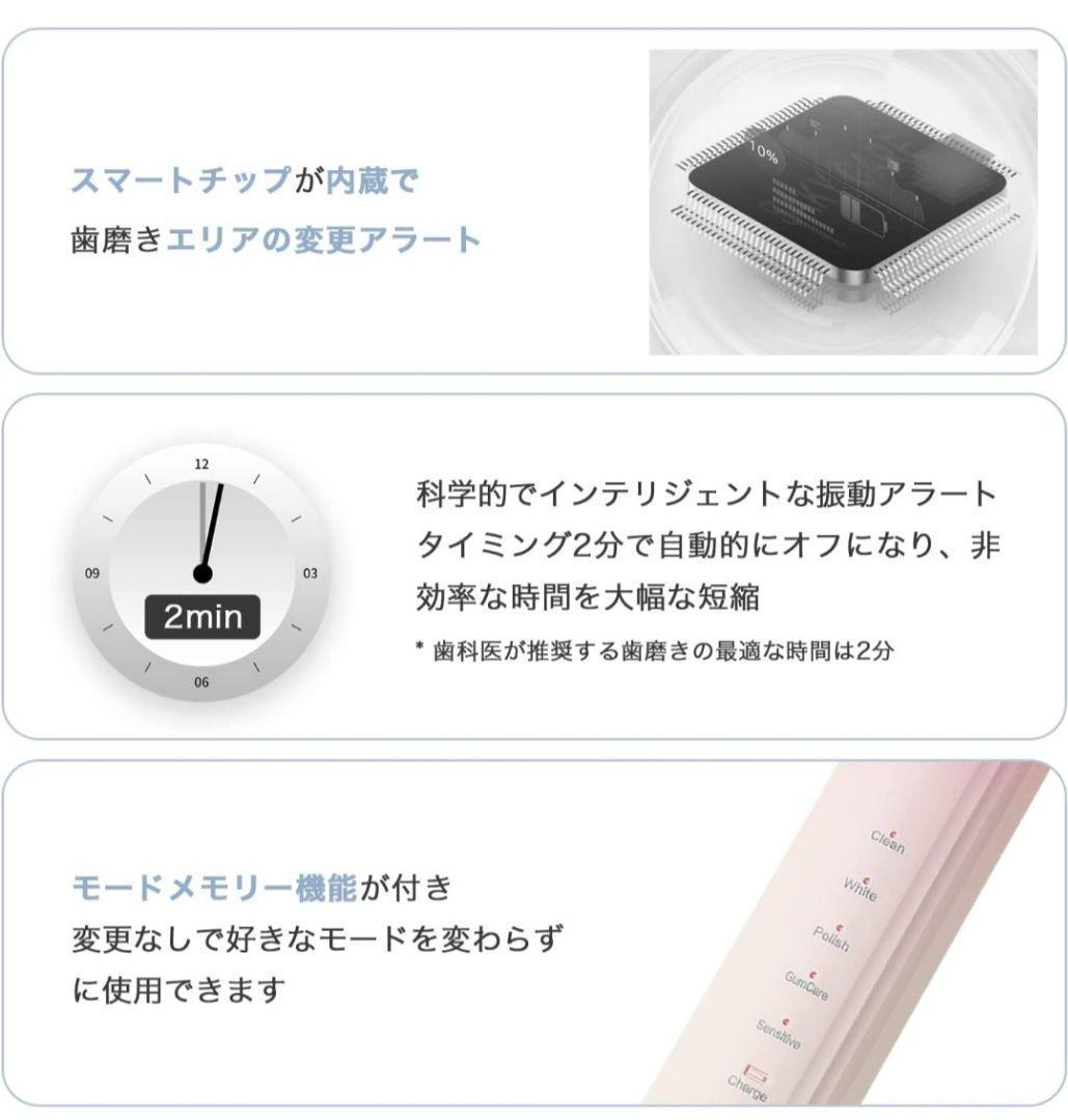 強力な音波洗浄・パワフルな洗浄力 強力モーターを採用した超高速音波振動により今までない磨き心地を実現した電動歯フラシ。 1 分間に約 38,000 回の高速振動にも関わらず、持ち手に負担をかけないモーターを採用しております。 歯ブラシ電動式の振動力は直接ブラッシングへと伝わり歯間と歯肉縁もしっかりとやさしく磨きます。 手磨きより100倍の歯垢を除去できます。 (振動の強さは個人差がありますので、ご了承ください。) $$3280