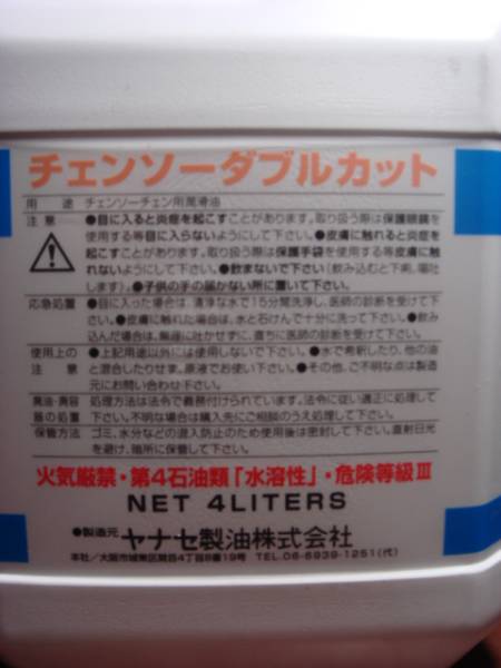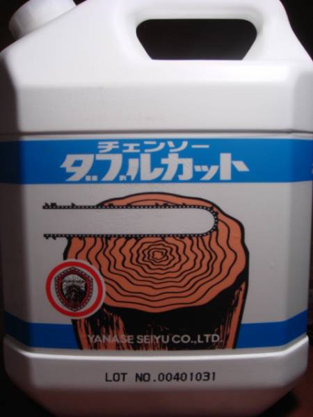 ヤナセ製油 チェンソーオイル ダブルカット 4L 新品未開封 小分けに便利なノズル付きです。チェンソーの刃を空運転して回したときに、地面に軽い線が着く位い出ていないと刃がやけてしまいます。粘度は、四季を問わずにご利用できます。(極端に寒い場合は、オイルが固くなる事があります。)このオイルの特徴としては、水溶性のオイルおため、作業中に衣服に着いても家庭用洗剤で、落とす事ができます。