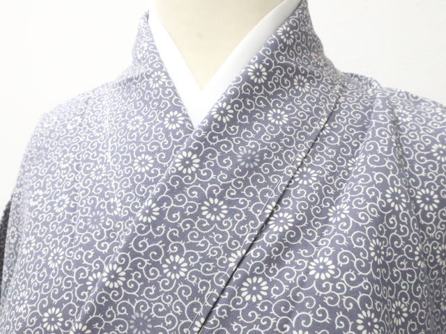 リサイクル商品のため、下前薄汚れがございます。 胴裏スナップボタン汚れがございますが着用可能なお品です。 地色は灰紫です。 1枚目の画像が近いお色かと思われます。 素材は正絹です。 |