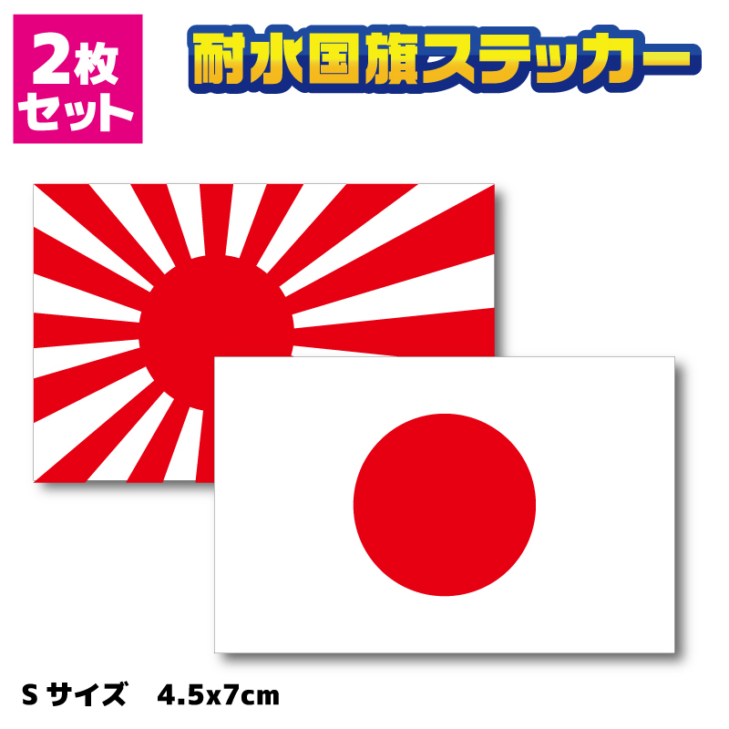 国旗ステッカー Sサイズ 2枚セットです ☆ 業務用溶剤インクを使用した 雨や直射日光に強い じょうぶな耐水ステッカー! 屋外OK! 耐水(防水)・耐候仕様です。 車やスーツケースのワンポイントに、ノートPCなどにもペタリとどうぞ! ■サイズ:縦約 4.5cm × 横約 7cm ■枚数:日本国旗ステッカーと旭日旗ステッカー 各1枚 2枚セット 耐水・屋外耐候 塩ビシート仕様 Made in JAPAN ・ 日本製 □□□□□□□□□□□□□□□□□□□□□□□□□□□□□□□□□□ ご希望のサイズ・仕様が出品されていない場合は質問欄にてお問い合わせください。 どうぞよろしくお願いします。 ★お休みのお知らせなどがある場合がございますので、 ご入札前に必ず自己紹介欄をご覧くださいませ。よろしくお願いします★ | ||