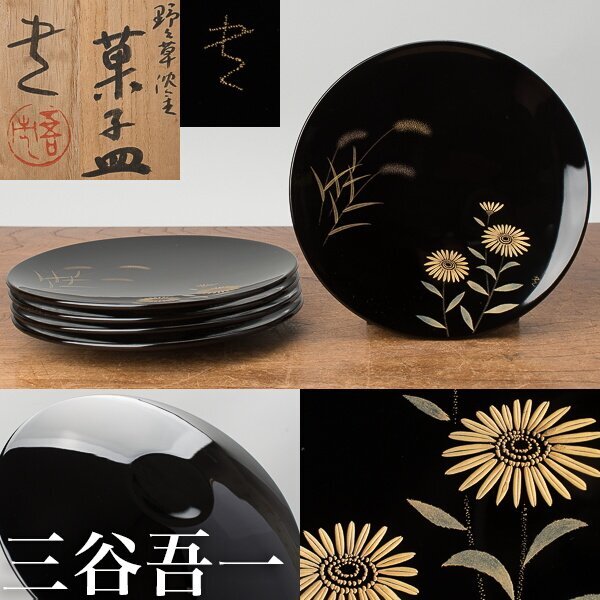 輪島塗、三谷吾一の野々草沈金菓子皿5枚。共箱有。真作保証。 もちろん本木地・本漆塗で、本金等を用いた手彫りによる沈金です。 サイズは、幅約15.5cm、高さ約1.5cm。 すべて傷・直し・ヤケ・歪み等ありません。 状態、詳細は画像でご確認ください。 |