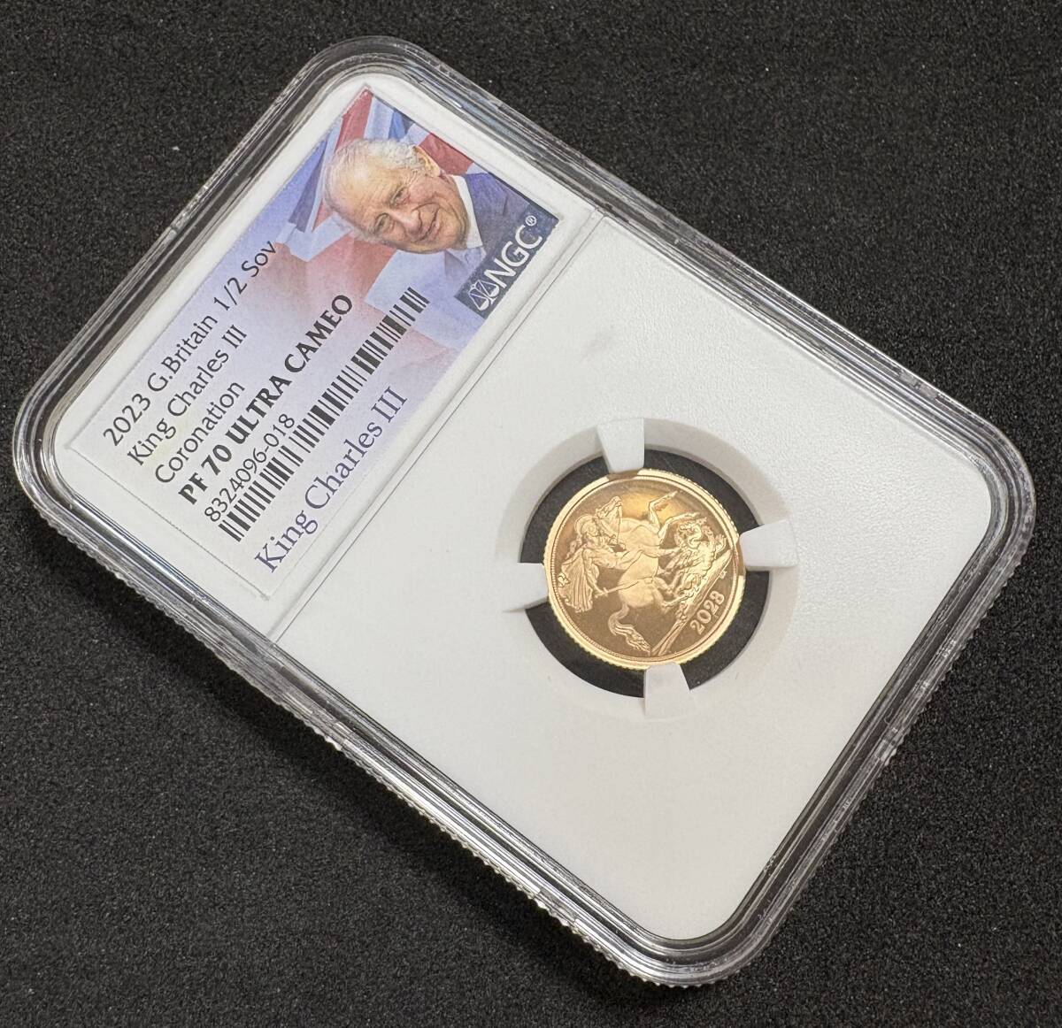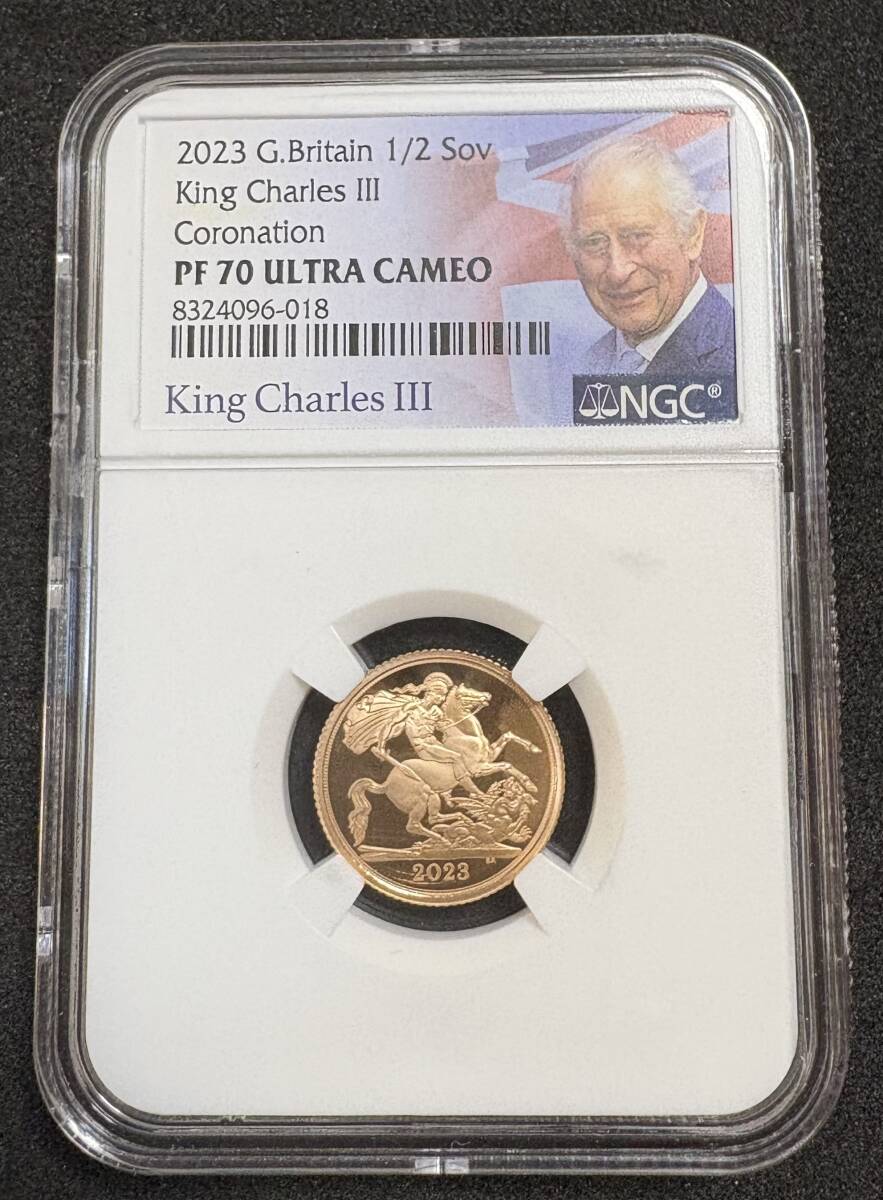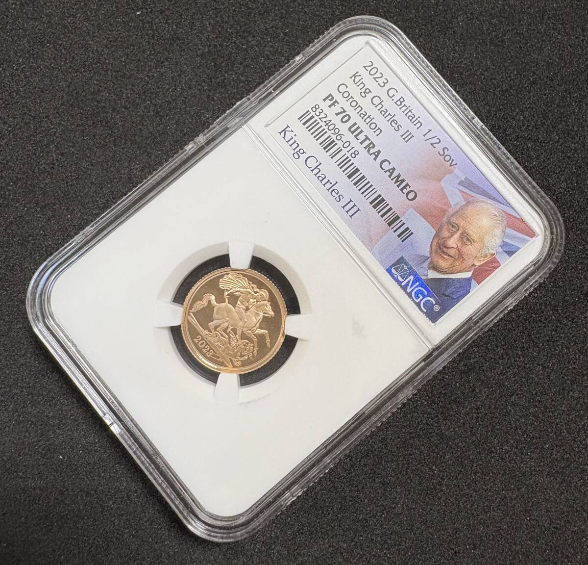 最高鑑定★ 2023年 イギリス ハーフソブリン 金貨 チャールズ3世 戴冠記念 NGC PF70 ULTRA CAMEO 聖ジョージ 竜退治 ピストルッチ 資産運用