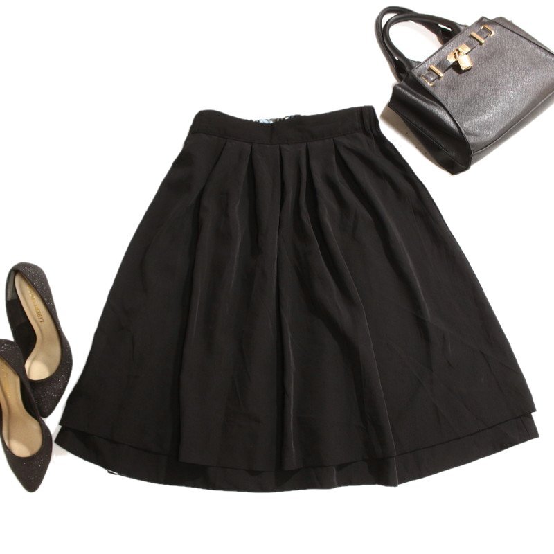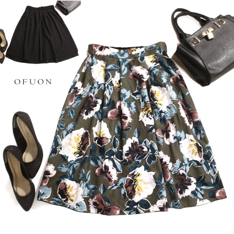 美品 リバーシブル オフオン スタイリッシュ OFUON stylish イトキン(株) フラワー プリント 無地 ウエストゴム フレアスカート 7号 36 黒