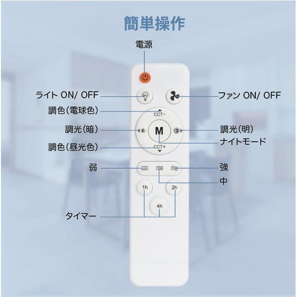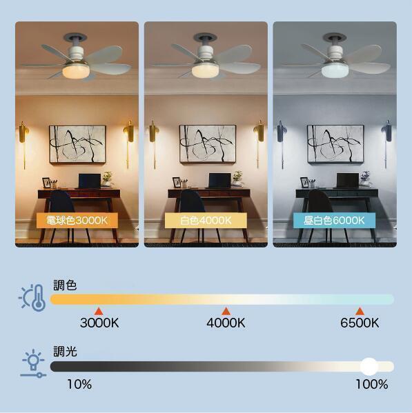風速&調光機能:リモコンで照明の色温度と風速を調整できます。2700K~6500Kの調光可能で、低速、中速、高速の3段階の風速が必要に応じて調整できます。