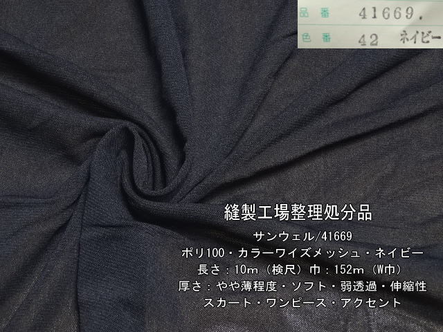 商品説明 | 縫製工場様からの整理・処分品の激安処分です。 商品知識は御座いませんが、大量の余財を処分させて頂きます。 商品は、サンウェル/41669・ポリ100・カラーワイズメッシュ 色調は、ネイビーでございます。 長さは、10m(検尺)巾は、152cm(W巾)です。 厚さは、やや薄程度・ソフト・弱透過・伸縮性がございます。 スカート・ワンピース・アクセントなどにいかがでしょうか。 この機会にお試し下さい。 |