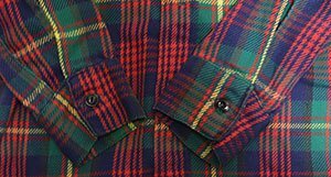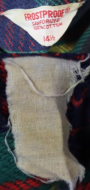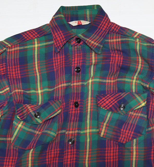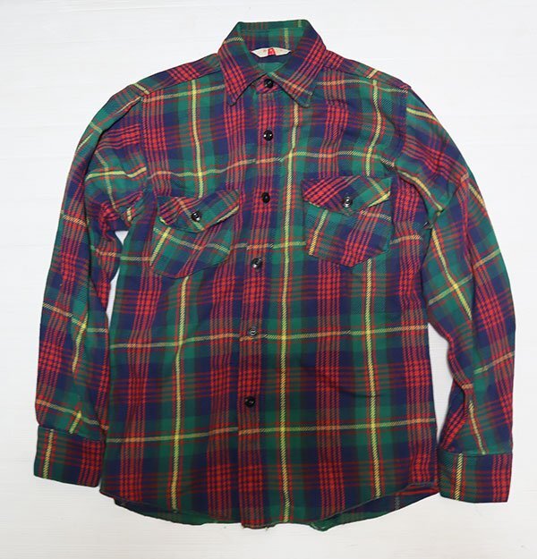 70-80年代頃のアメリカ製(表記は読めませんが)三角タグのPROSTPROOFの織りネルチェックシャツの赤系x緑系他チェックです。