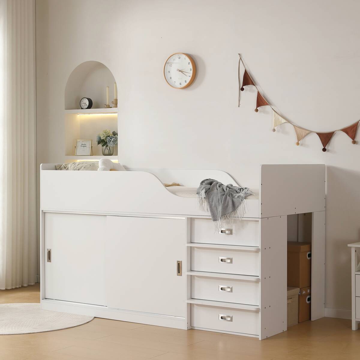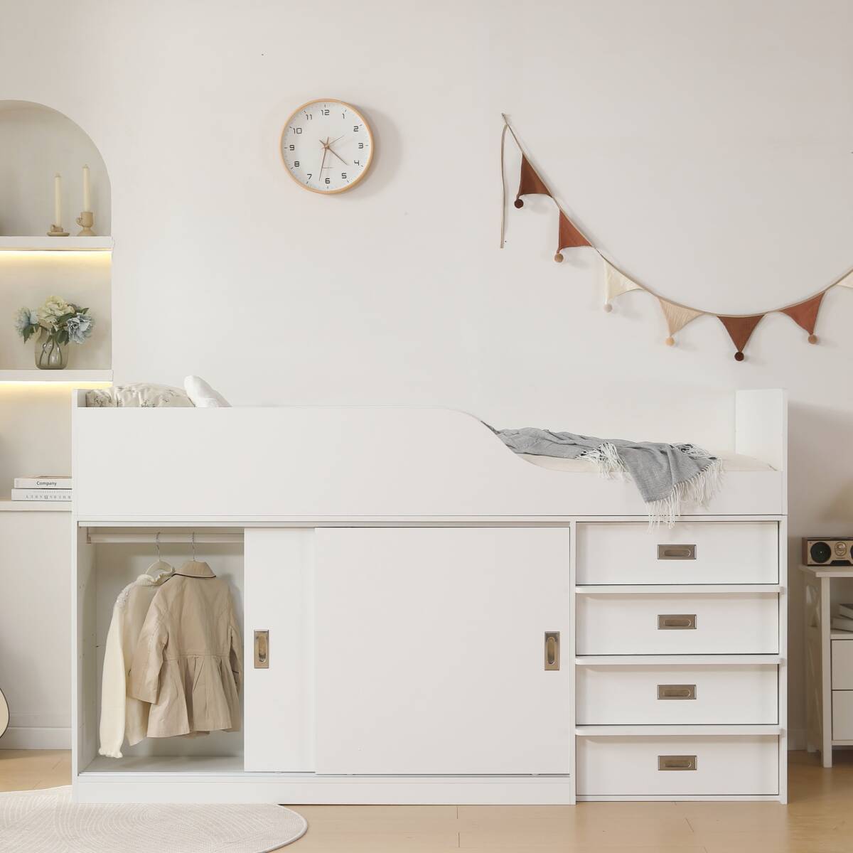 梱包個数は複数になり、お届け日・時間に若干のずれが生じる場合がございます。【ロータイプデザイン 】 高さ115cmのロータイプシステムベッド、天井からの圧迫感が少なく、お子様の顔も見えやすい安心設計になっています。【お部屋に必要なモノが揃っている 】寝室に必要なものを一箇所につくる、快適な眠る、勉強、収納が叶える一台です。【たっぷり収納空間】衣類や雑貨など入れたいアイテムに合わせてすっきり収納できます。 便利なオーペンスペース本棚やディスプレイ棚としてお使いいただけます。【垂直ハシゴで省スペース】垂直タイプハシコは場所を取らず省スペース、見た目もすっきりしています。大人でもお子様でも安心にご利用いただけます。【とにかく省スペースになる 】 デスクとシェルフをベッドの下へすっきり収納でき、お部屋の限られたスペースを最大限に活用。【子供から大人まで使えるシンプルデザイン 】お子様から大人までお使頂ける飽きのこないシンプルデザインです。【安心設計の耐荷重200kg 】 しっかりの耐荷重とシンプルなデザインで子供にも大人にも使えるベッドです。