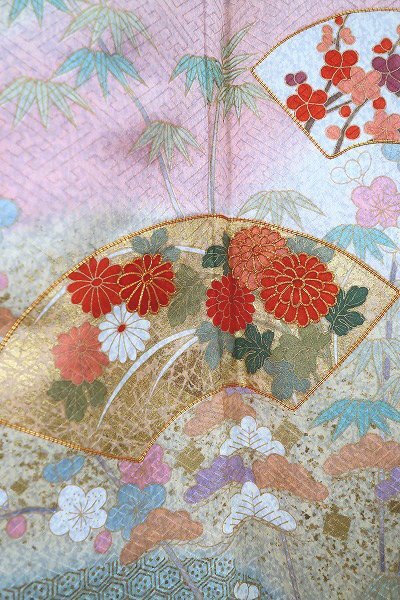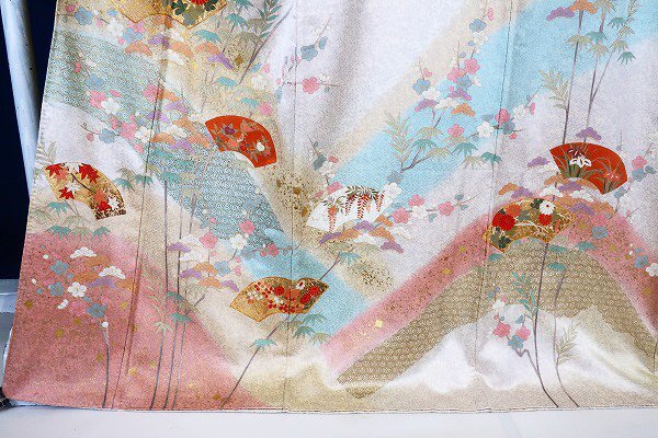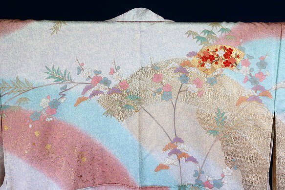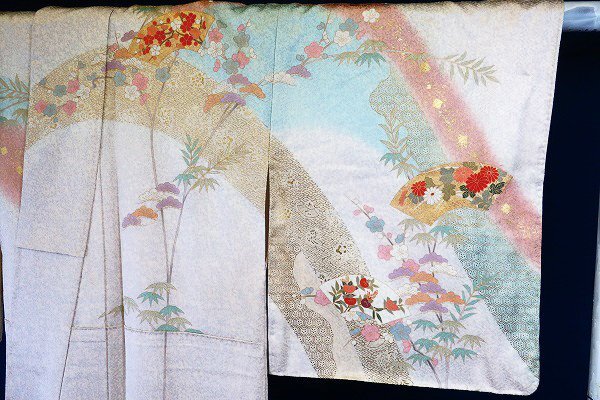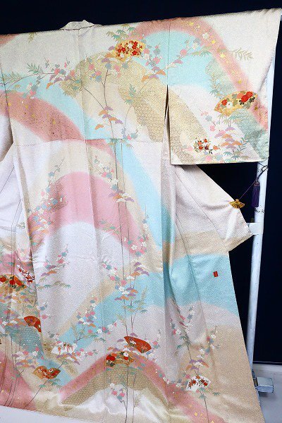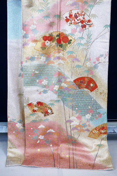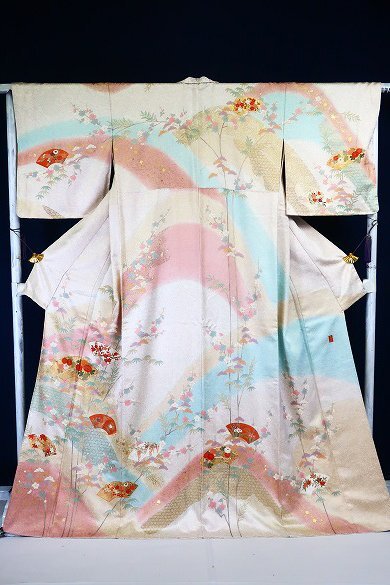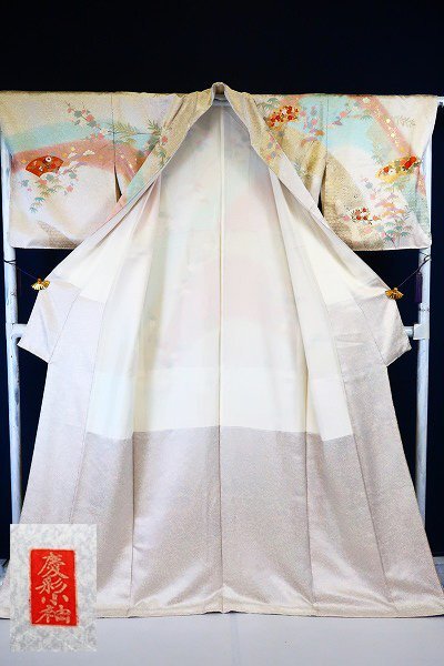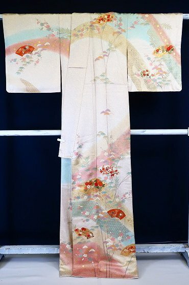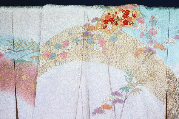 オフホワイトとグレーの斑の絹地に、枝梅や松、扇面に菊や楓が描かれた訪問着です。 金駒刺繍や金彩加工が華やかに施され、パステルカラーのお色味が素敵な一枚です。 落款入りです。 未使用品です。 担当:伊藤 |