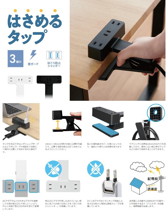 電源タップ 雷ガード 3個口 クリップ ほこりシャッター付_B