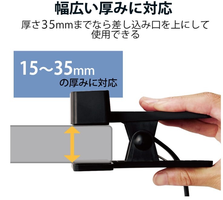 ■クリップ機構を搭載し、机などに挟んで利用することができる2ピン式の