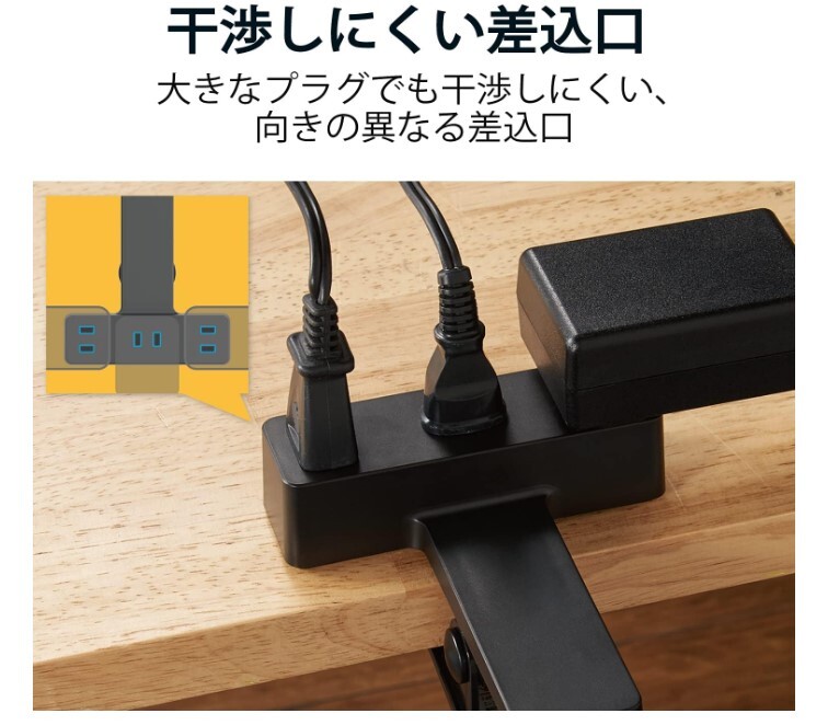 ACアダプタなどの大きなプラグを接続しても隣の差込口に干渉しにくいよう、