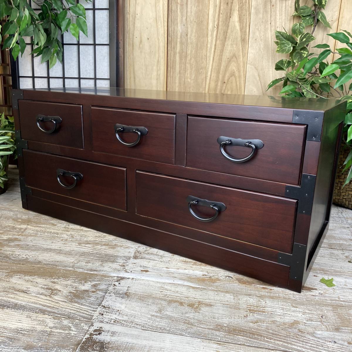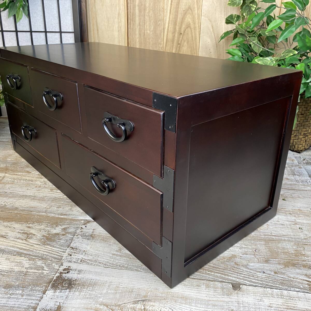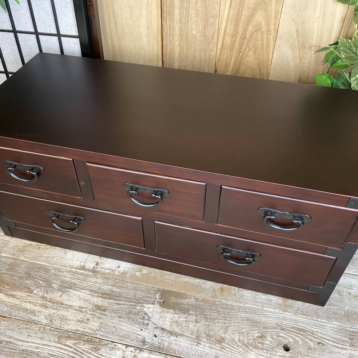 ◆◇商品詳細◇◆ 民芸家具和タンス多引き出し 民芸調の落ち着きのある素敵な和箪笥です。どこか懐かしい和の温かみがあるお品。材質は桐材を使用しているため手触りが柔らかく、調湿性・耐火性・防虫性に優れています。変形などもなく長年愛用していただけます。桐材なので軽くて持ち運び、移動など楽々です。古き良き時代を思い出させるデザインで和室、アジアンインテリアにぴったりです。黒塗りの金具が高級感があり、お部屋に置くだけで存在感抜群!お色は飽きのこない濃い目のブラウンで重厚感を演出しています!人気商品が今だけこの価格!他では買えない民芸商品をぜひこの機会に。 【商品状態説明】 小キズあり、まずまずの美品。 完成品になります。 ※こちらの商品は、現品画像ではありません。在庫の中から丁寧に検品後、発送いたします。 【サイズ】 横幅:80㎝ 奥行:35㎝ 高さ:34.5㎝ 引き出し内寸小:21㎝×30㎝×9㎝ 引き出し内寸大:33㎝×30㎝×9㎝ 桐材 【カラー】 ブラウン 【参考価格】 ¥18,000 | ◆◇発送方法◇◆ ●送料は基本無料ですが、沖縄・離島などにお住まいの方はご負担ください。 (沖縄・離島の方はメールにてご連絡いただければ、送料をお知らせいたします。) ●ヤマト運輸・佐川急便・第一貨物のいずれかにて配送いたします。 (運送会社の指定はできません。ご了承ください。) ●日時・時間指定のある方や、お問い合わせ(追跡)番号をご希望の方は取引連絡の際にお知らせください。 | |