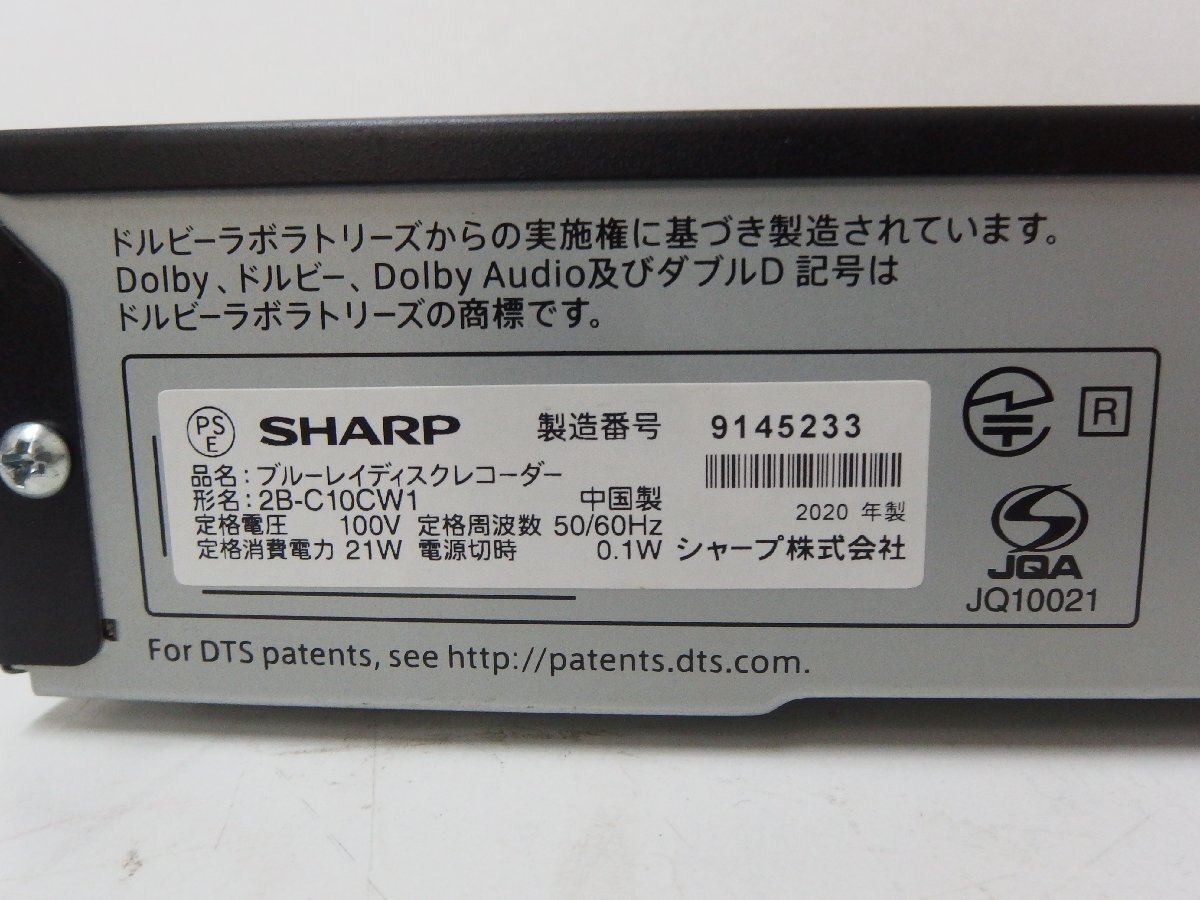 10▲/Zク5396 保証有 ☆ SHARP AQUOS ブルーレイディスクレコーダー 2B-C10CW1 2020年製 訳アリ 中古