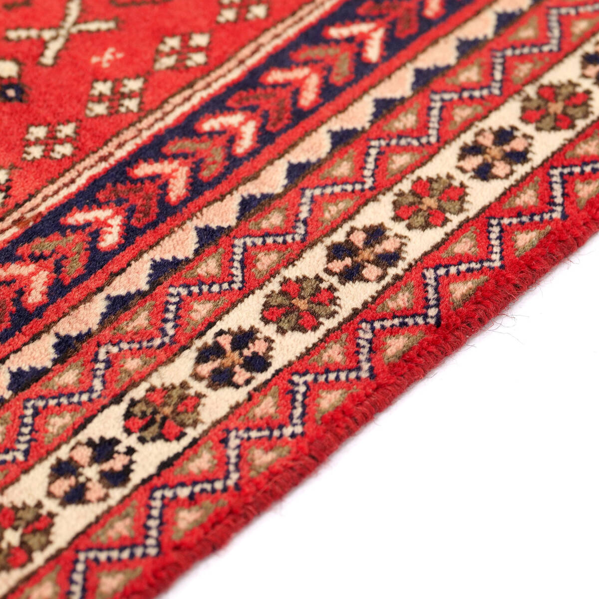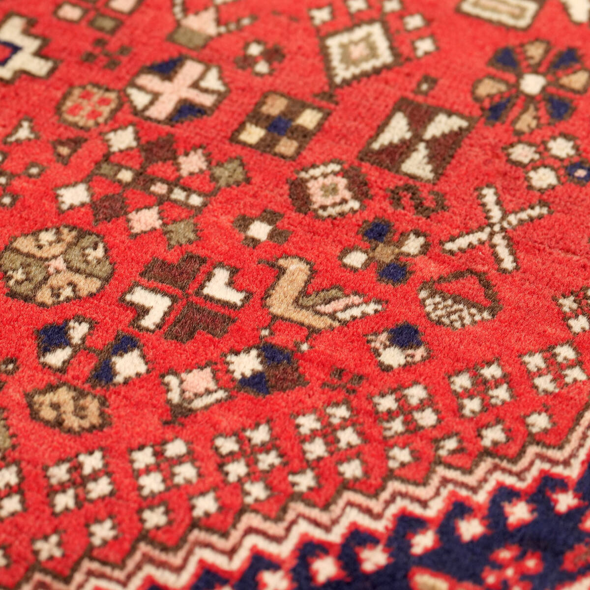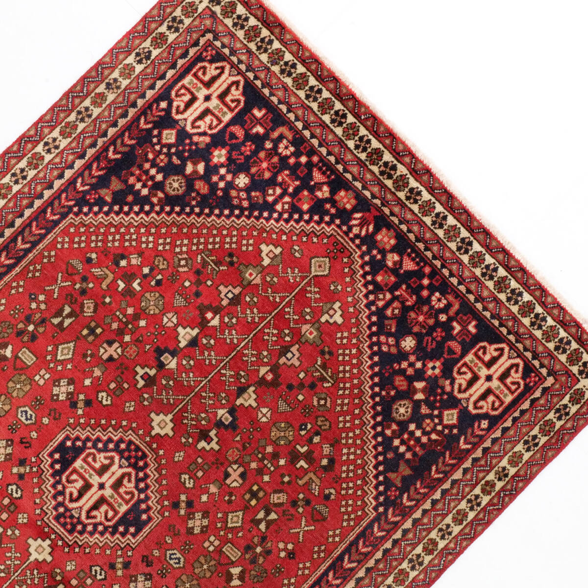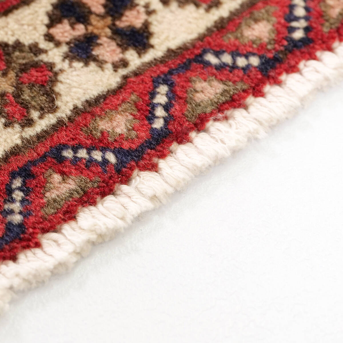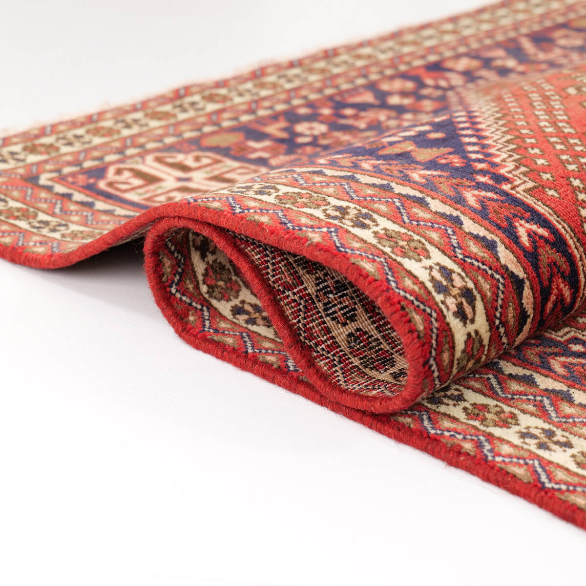 赤を主調とし、藍やベージュ、オリーブをアクセントにした落ち着きある配色。メダリオン周囲に施された濃紺のコーナーが全体に奥行きを与えています。