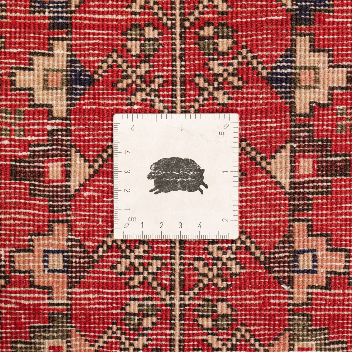 1950年代にアバデで制作されたセミアンティークの手織り絨毯です。中央の鋸歯状ダイヤモンドメダリオンを中心に、フィールド全体に細やかな幾何文様や部族的モチーフが織り込まれ、力強いデザインが際立ちます。
