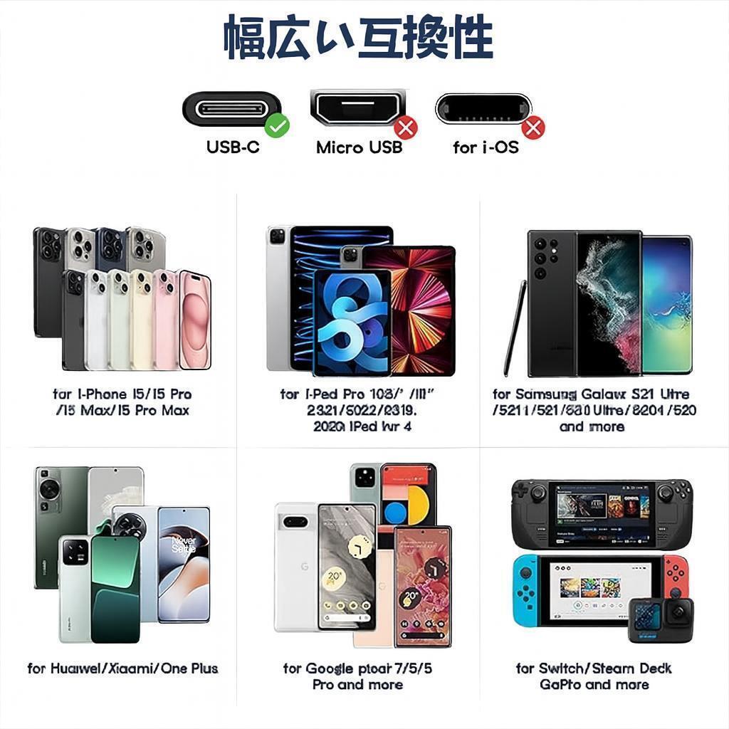 iPhone 16/15シリーズ、iPad Pro、Galaxy S23/S24、Pixel、Xiaomi、OPPO、HUAWEIなどUSB-C対応機器