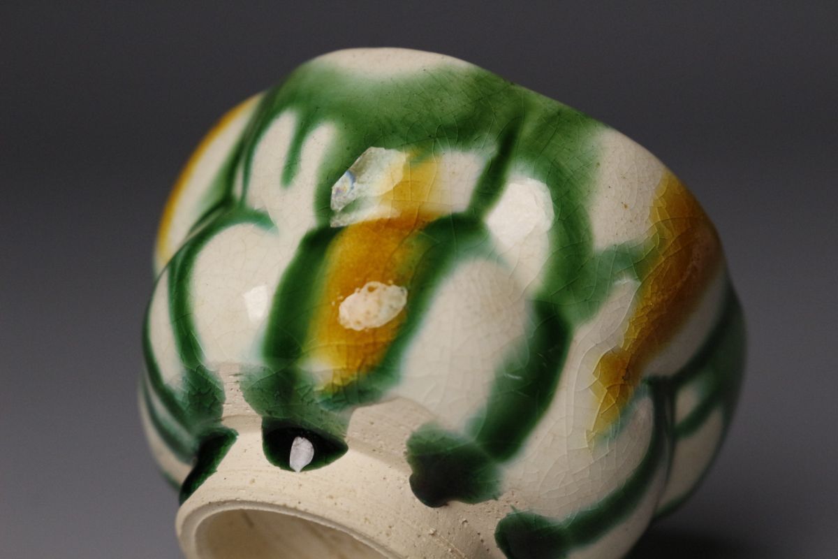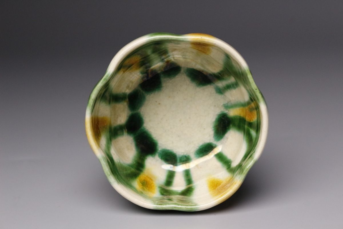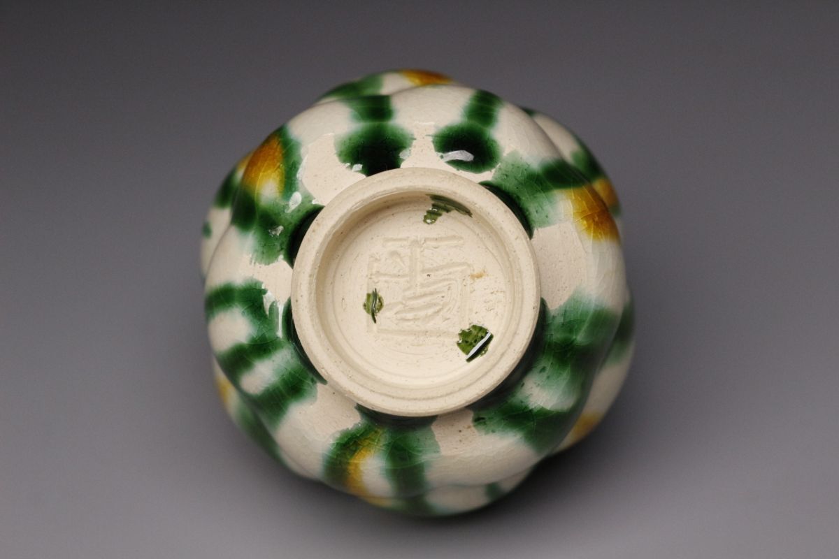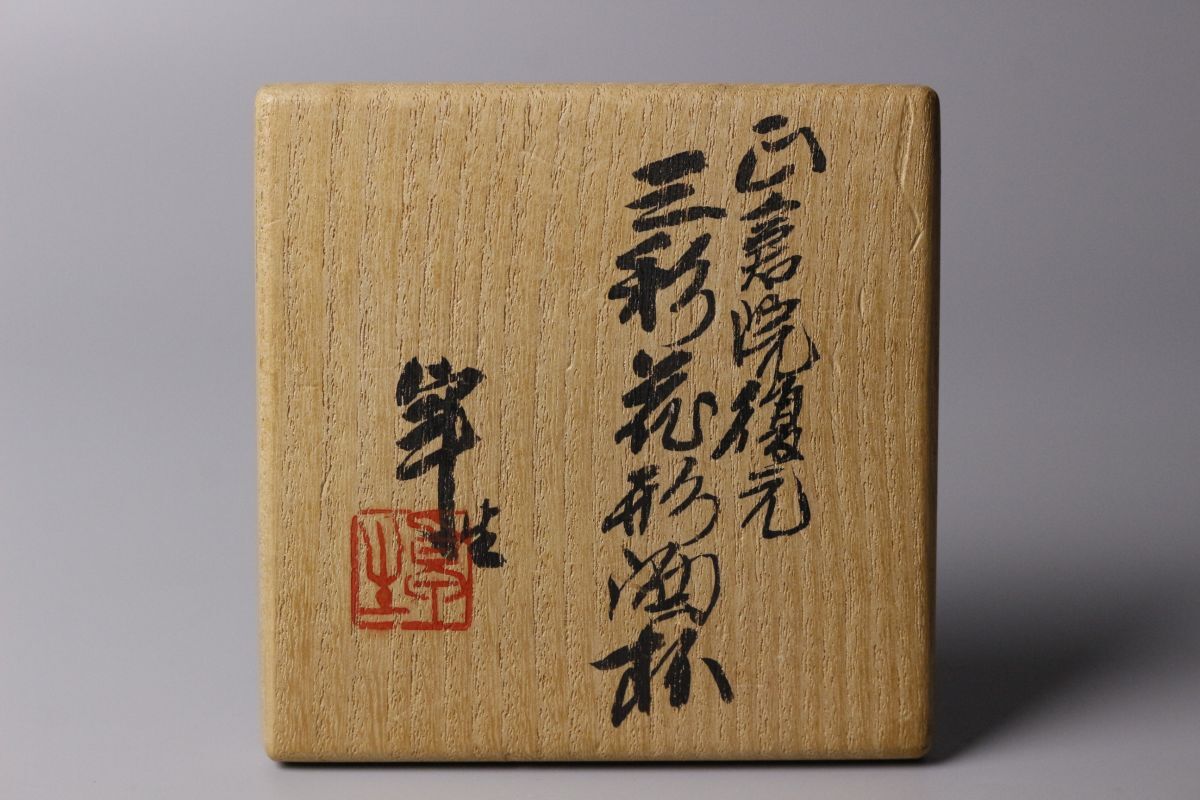 人間国宝 加藤卓男による奈良正倉院の御物を再現復元した作品 三彩花形酒杯のご紹介です。 ふっくらとした花形の可憐な意匠と 緑と黄色を基調とした爽やかな色彩が目を惹く 人間国宝に認定された代表的技法「三彩」の作品です。 色彩豊かな酒杯の鮮やかな釉薬の深い表現と 無色の釉薬がかかった硬質な陶器の肌地は素地とのさりげない対比も心地良く 釉薬の溜りや見事な貫入、360度何処から見ても鑑賞応えのある素晴らしい作品となっております。 加藤卓男による素晴らしい逸品を この機会に是非お手元にてご堪能ください。 作家略歴 1917年 9月12日、五代加藤幸兵衛の長男として生まれる。 1961年フィンランド工芸美術学校修了。 1963年第6回日展で特選北斗賞受賞。 1973年イラン・パーレヴィ王立大学付属アジア研究所留学 およびペルシア古陶発掘調査に参加。 1980年宮内庁より正倉院三彩の復元制作を委嘱される。 1983年岐阜県重要無形文化財に認定される。 1986年トルコ・トプカプ宮殿美術館にて個展。 1988年紫綬褒章受章。 1992年伊勢神宮の御神宝「陶猿頭形御硯」を制作。 1995年国指定重要無形文化財保持者(人間国宝)に認定される。 1996年岐阜県名誉県民の称号を受ける。 2005年1月11日、永眠。