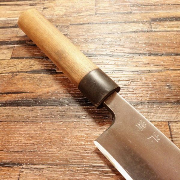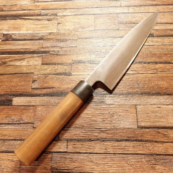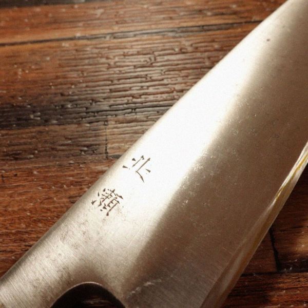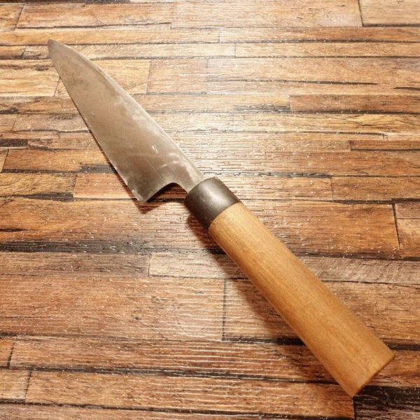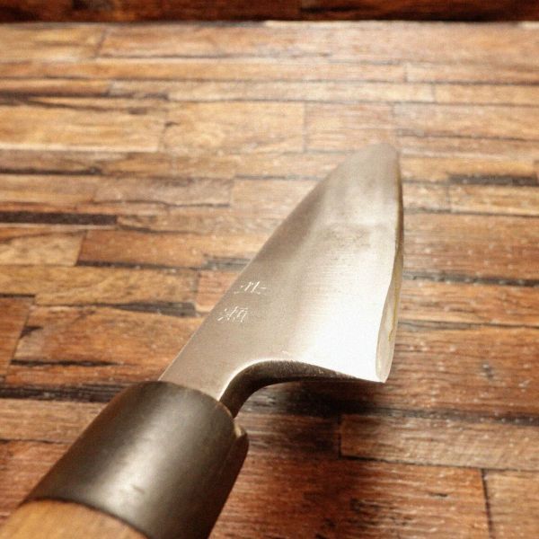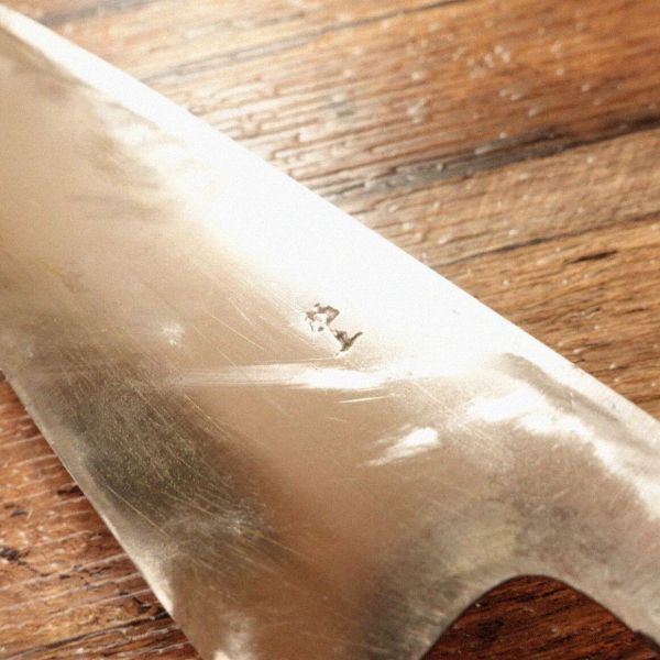 身卸包丁は出刃包丁と柳刃包丁の性質を兼ね備えた細身の包丁で、魚をおろすのに適しています。このお品は片刃のハガネ製で、力強い切れ味を持っています。丁寧に使われてきたお品でしょう。まだまだこれから活躍させてあげてほしいお品です。