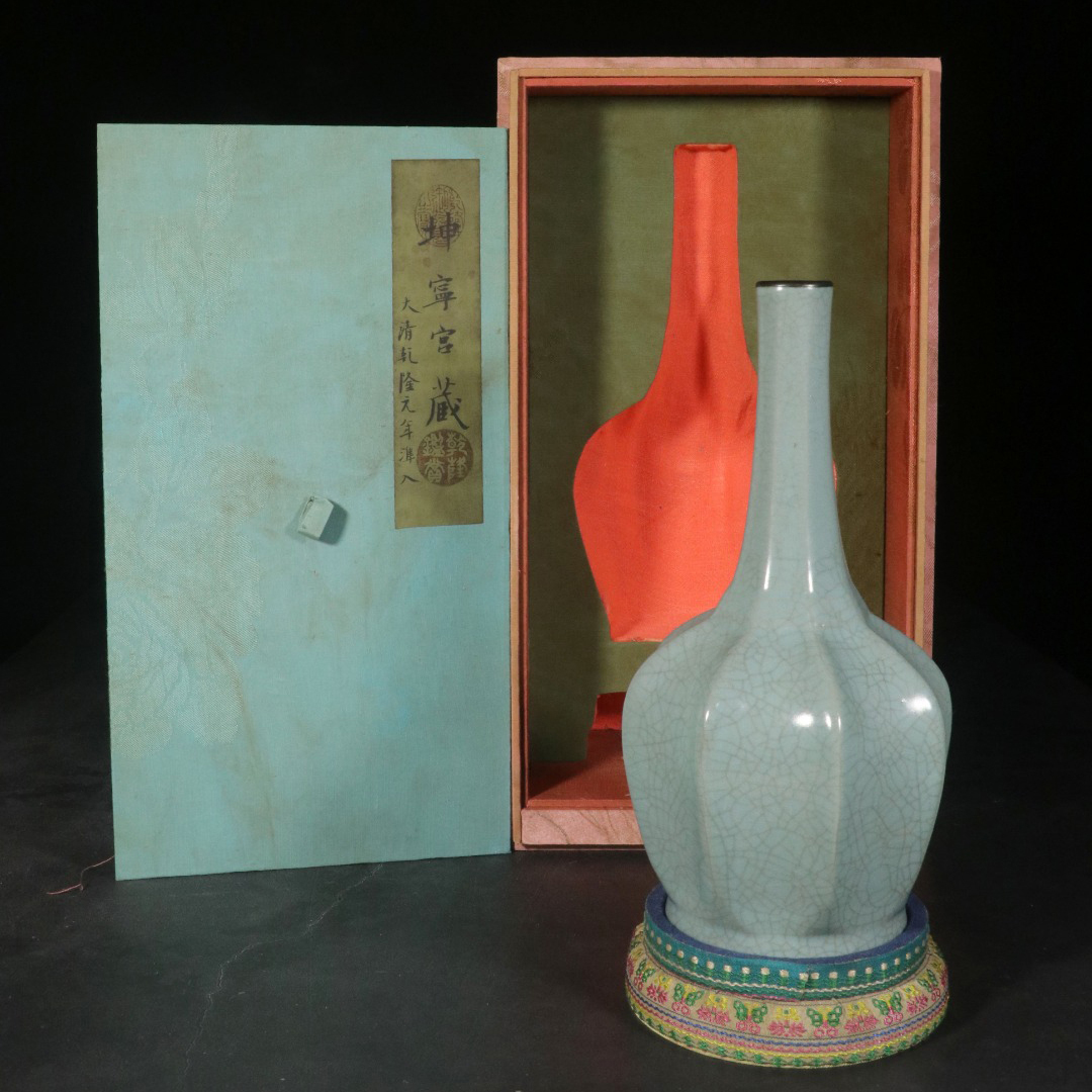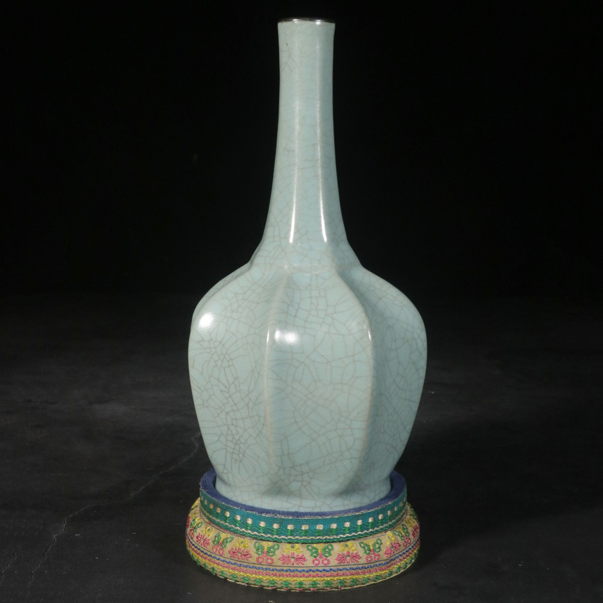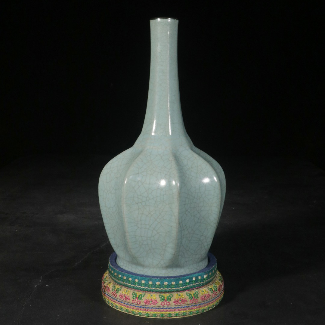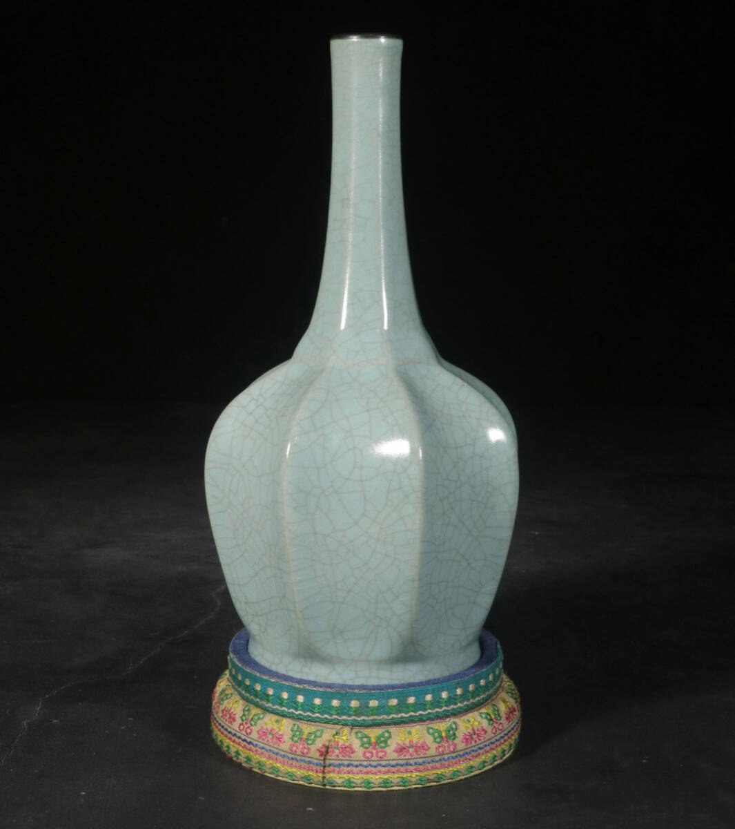 ◆御泓軒◆『宋朝時代 陶磁器 汝窯天青釉包銀口瓜稜紋長頸瓶・箱付』極細工・古賞物・中国古玩・中国古美術
