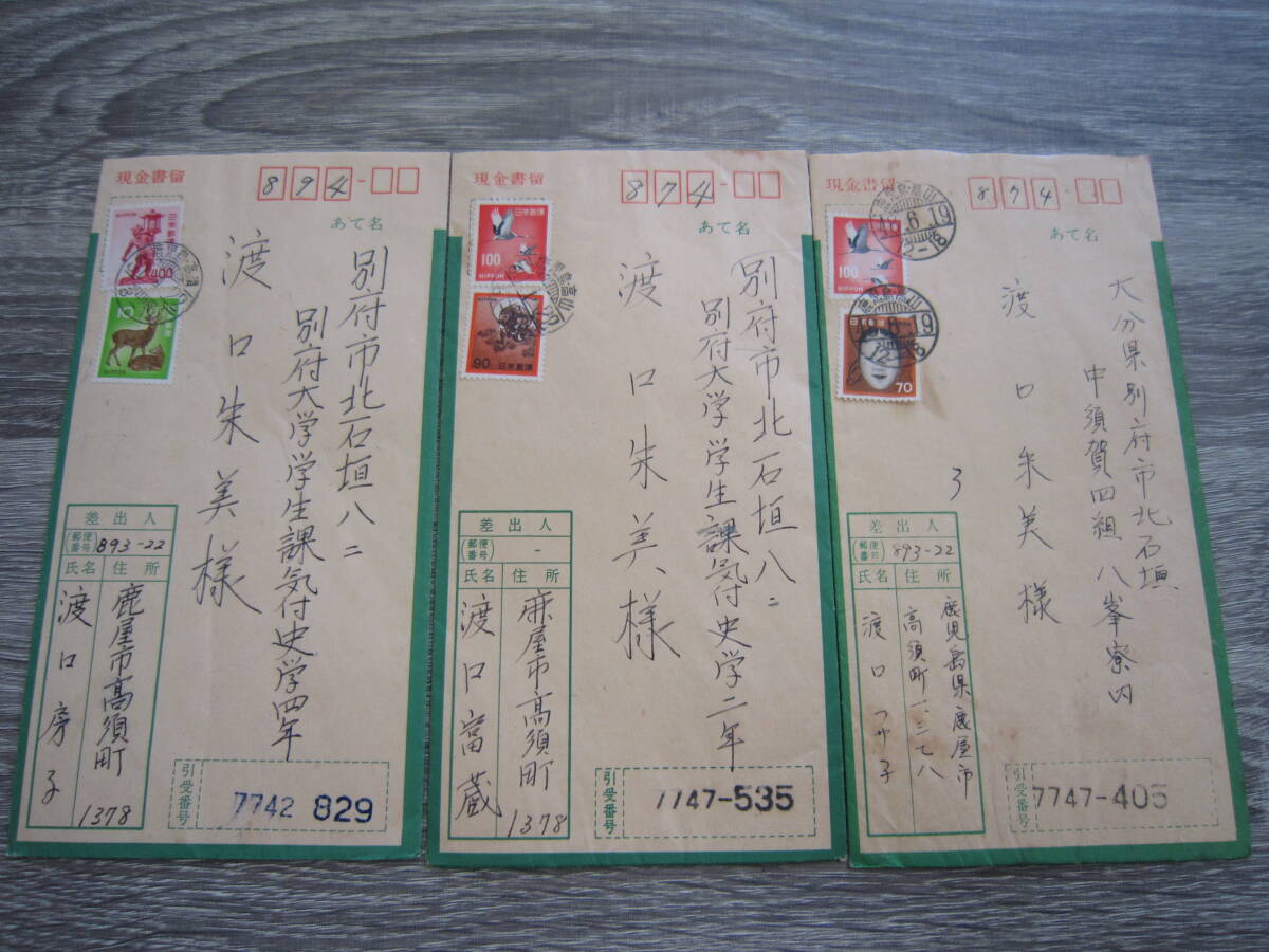 現金書留 普通切手 丹頂鶴100円切手 能面70円切手 鹿児島・高山 48.6.19 12-18