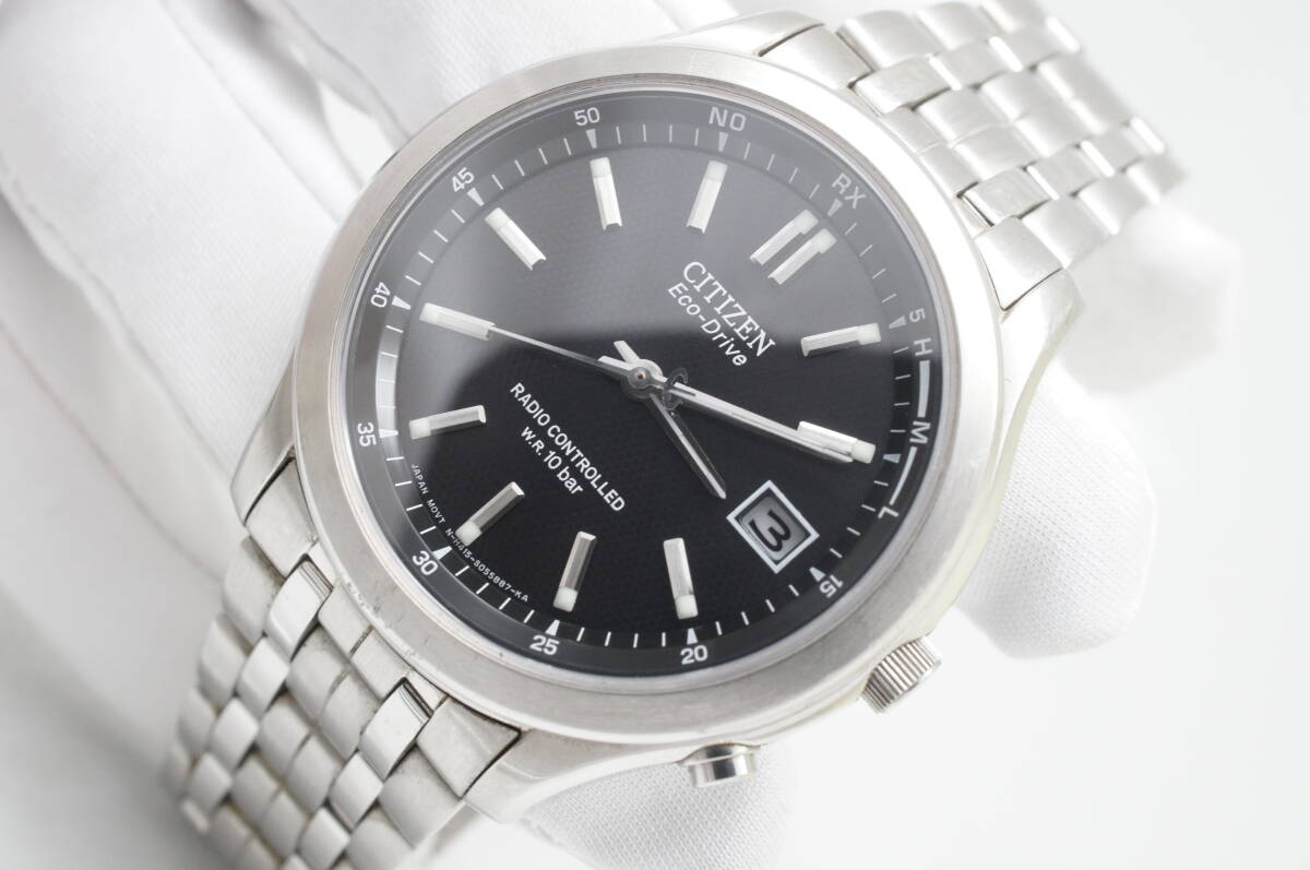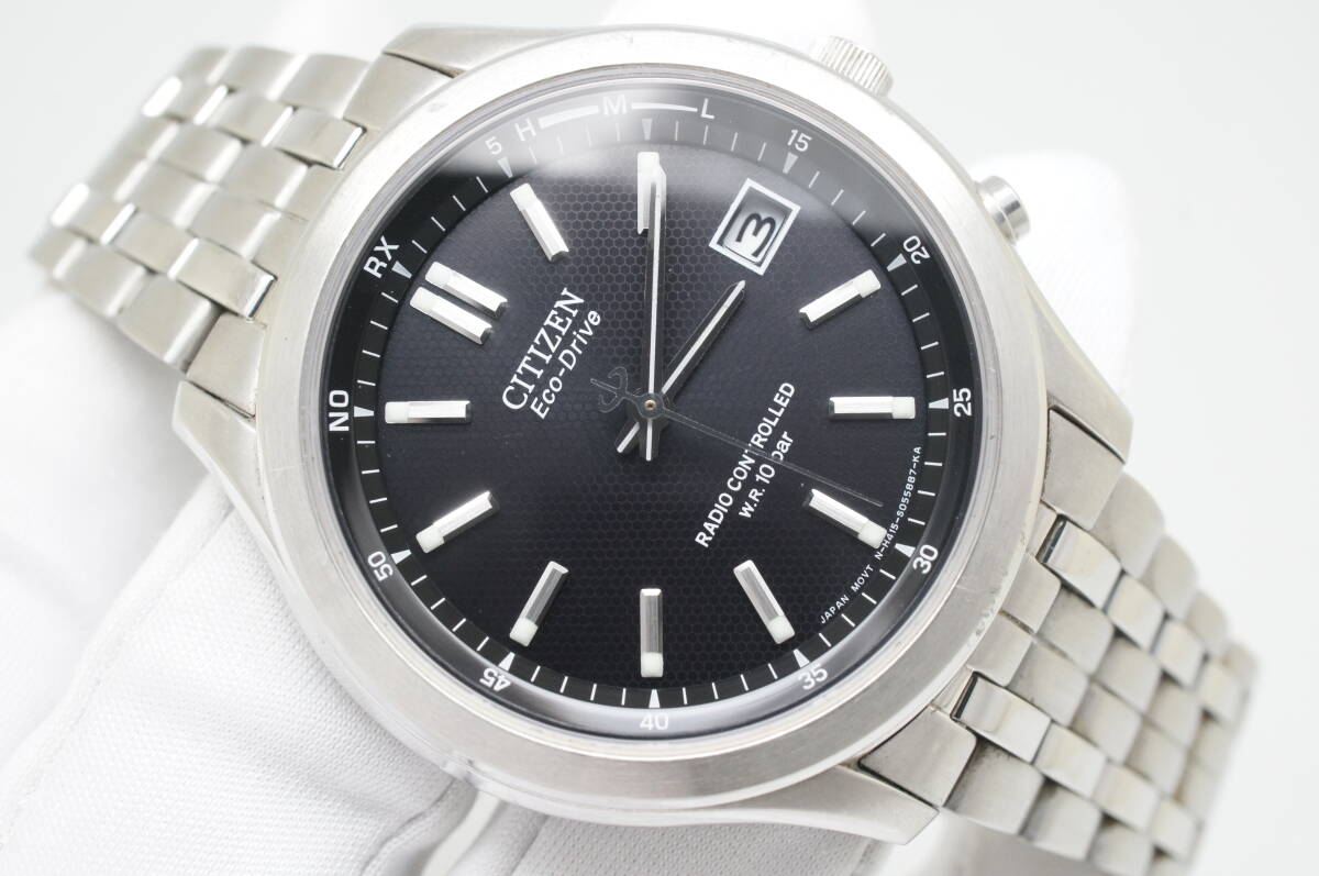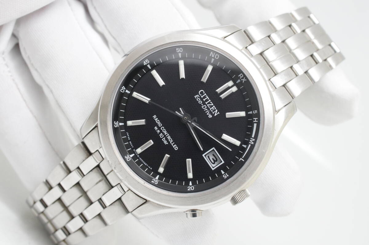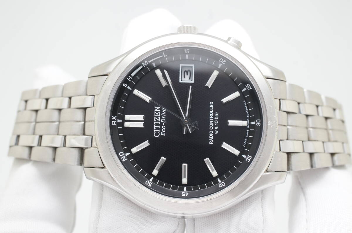 Z32●作動良好 CITIZEN シチズン Eco-Drive エコドライブ 電波ソーラー H415-S045495 黒文字盤 デイト メンズ腕時計 シルバー お洒落