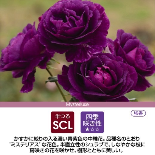 かすかに絞りの入る濃い青紫色の中輪花。品種名のとおり’ミステリアス’な花色。半直立性のシュラブで、しなやかな枝に房咲きの花を咲かせ、樹形とともに美しい。フェンス、アーチやオベリスク仕立てにも向く。