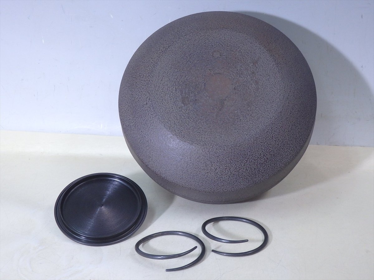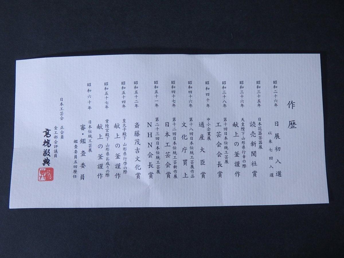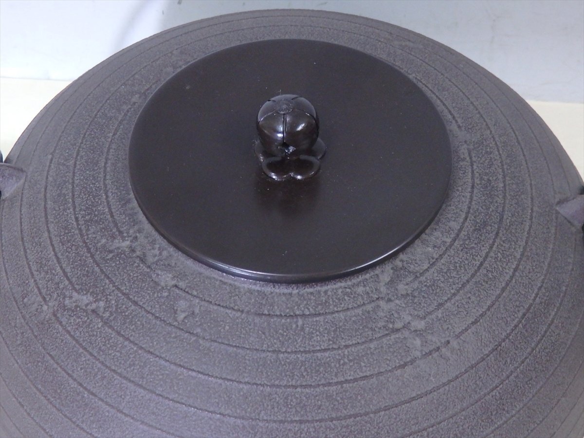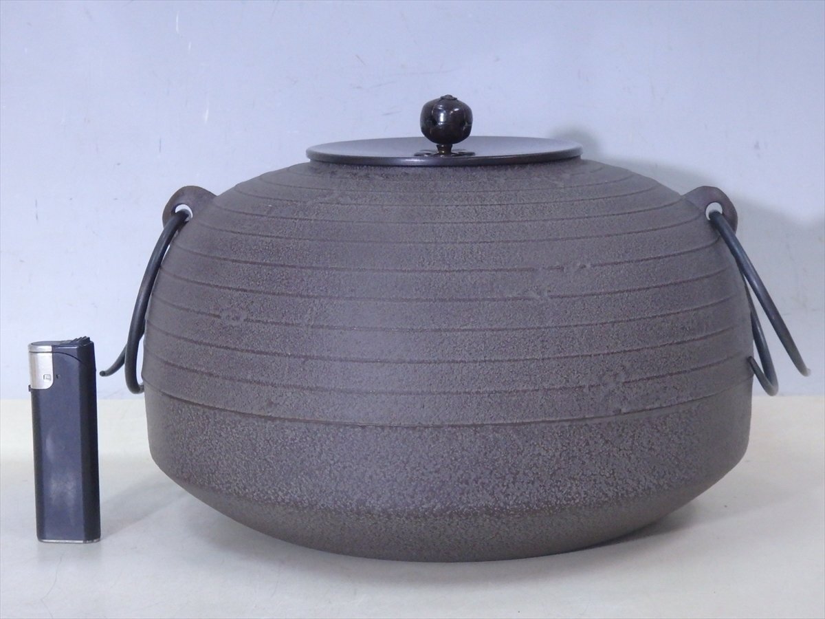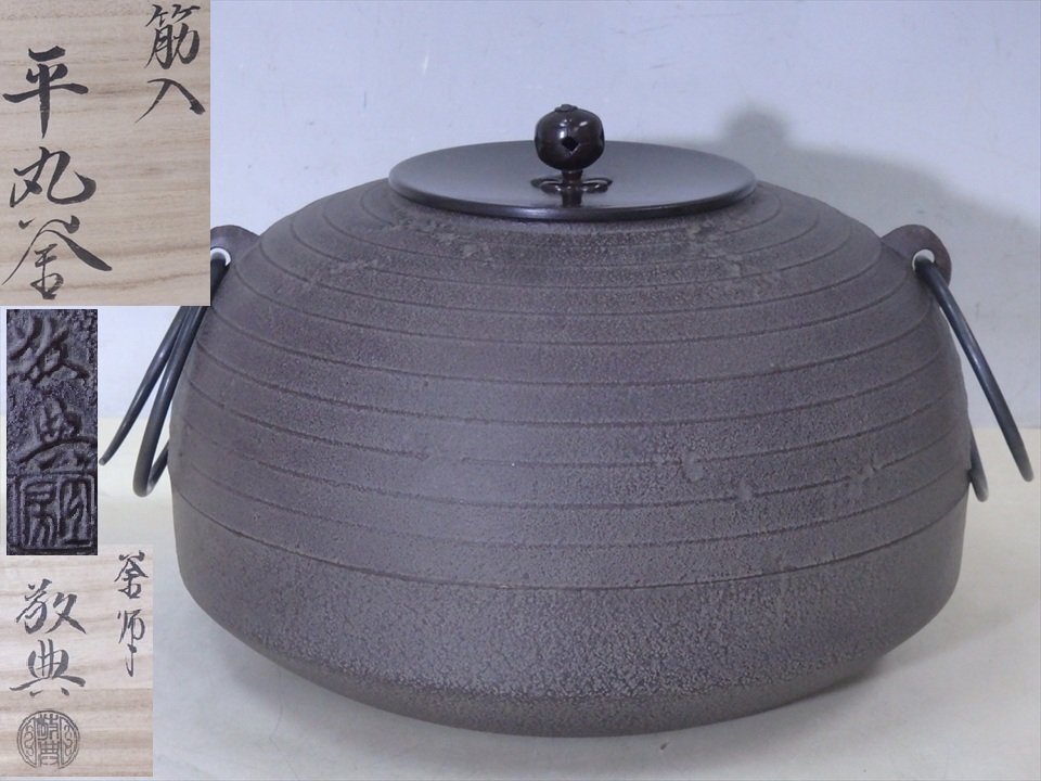 ★未使用 釜師 高橋敬典作(人間国宝)【筋入平丸釜 共箱】重さ約4キロ 釜鐶付 定価95000円 胴径25cm 茶道具 炉釜 茶器