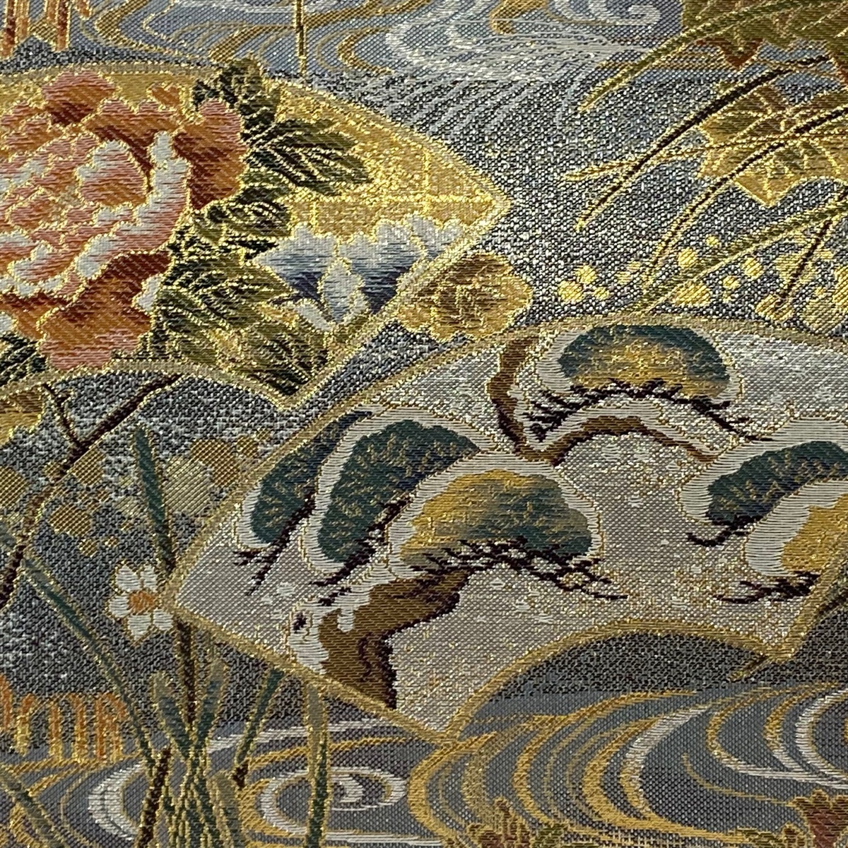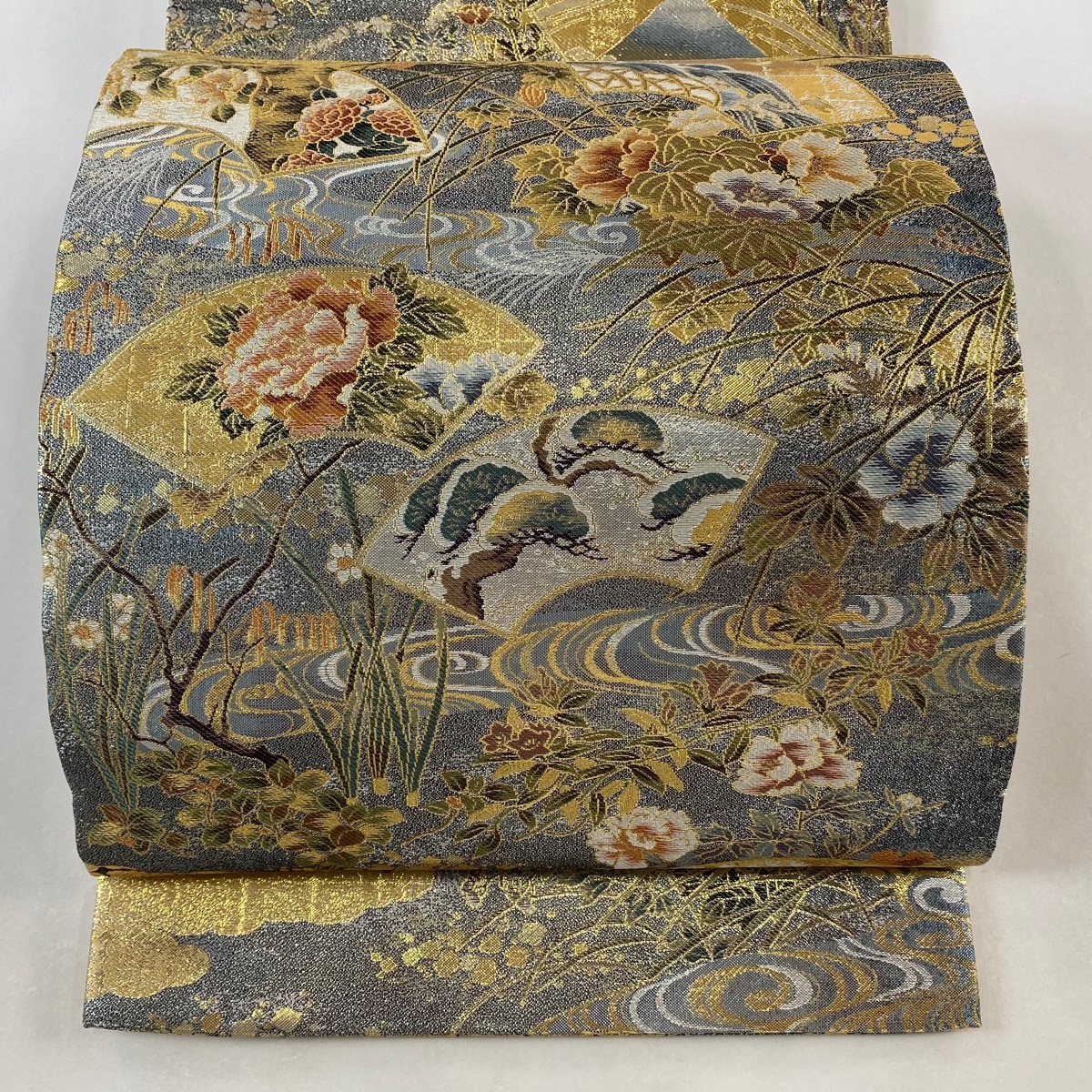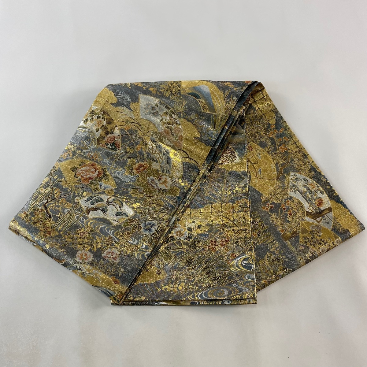 | 丸帯 美品 逸品 扇面 草花 金糸 箔 灰色 お太鼓柄 正絹 【中古】 |