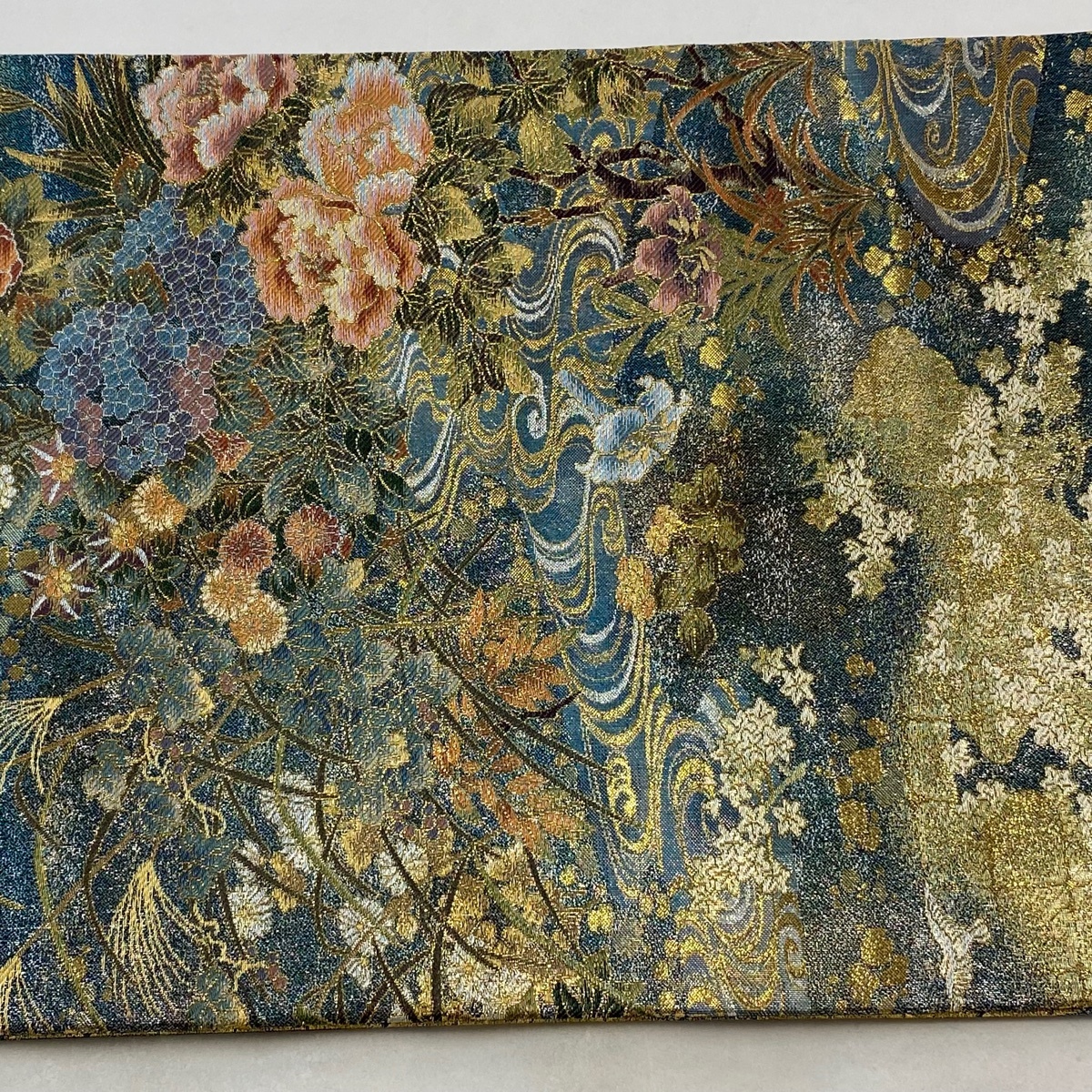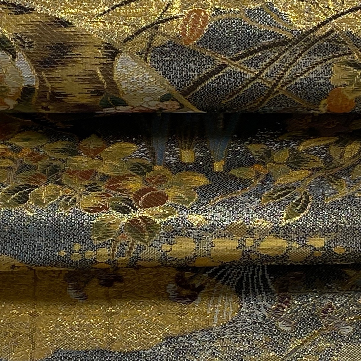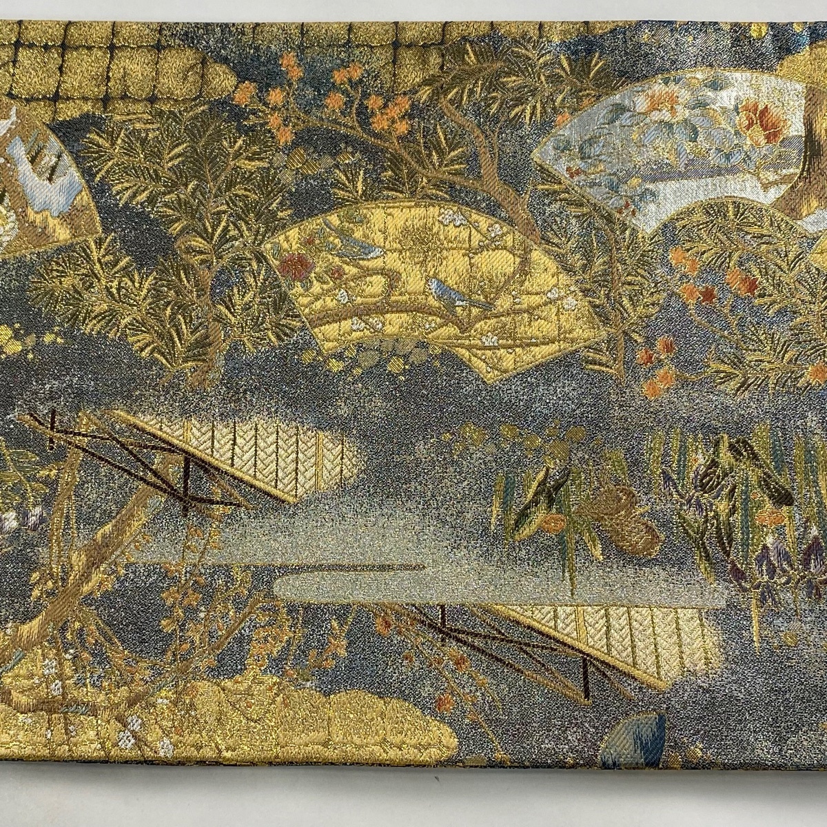 | 丸帯 美品 逸品 扇面 草花 金糸 箔 灰色 お太鼓柄 正絹 【中古】 |