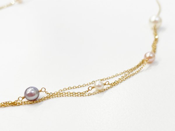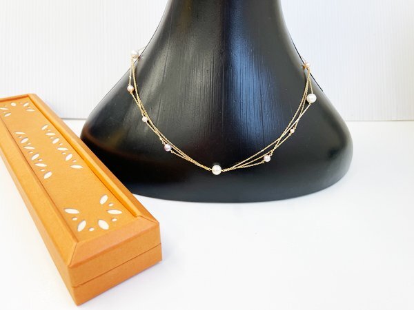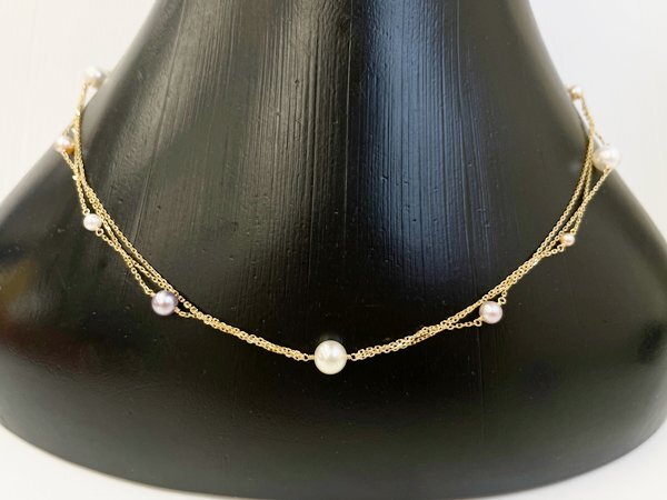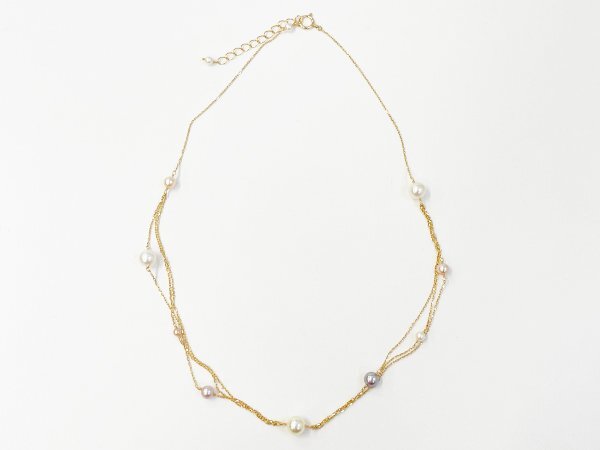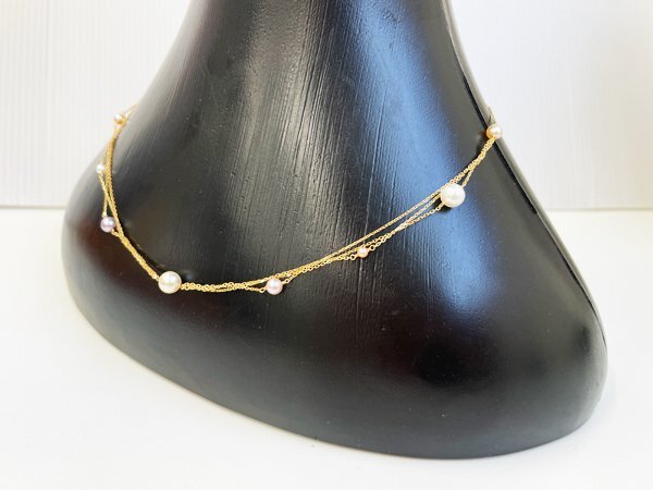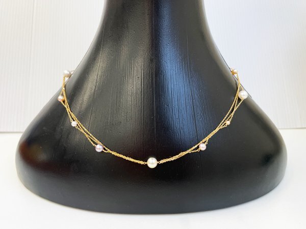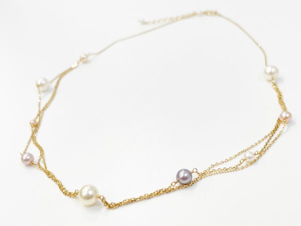 ネックレス K18 YG 金 淡水パール 11珠 3連 あずきチェーン デザイン ジュエリー/ゴールド×マルチカラー/1円スタート/AY
