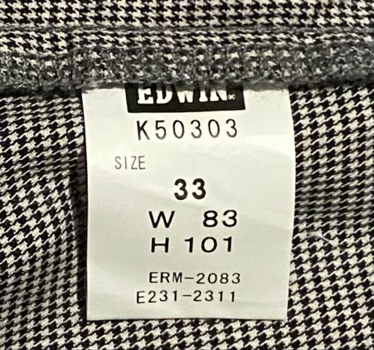エドウィンのストレッチパンツ、K50303です。USEDですが状態は良いです(10段階中8程度)。生地はストレッチ入りで綿92%、麻6%、ポリウレタン2%です。ジッパーフライです。正規品です((株)エドウィン商事、中国製)。サイズはW33(W83 H101)でウエストは重ねずに平置きで約83cm、ヒップ約108cm、股上約28cm、股下約83cm、股下15cmのふともも部分約56cm、裾まわり約44cm、重量約410gです。発送はゆうパケットポストになります。
