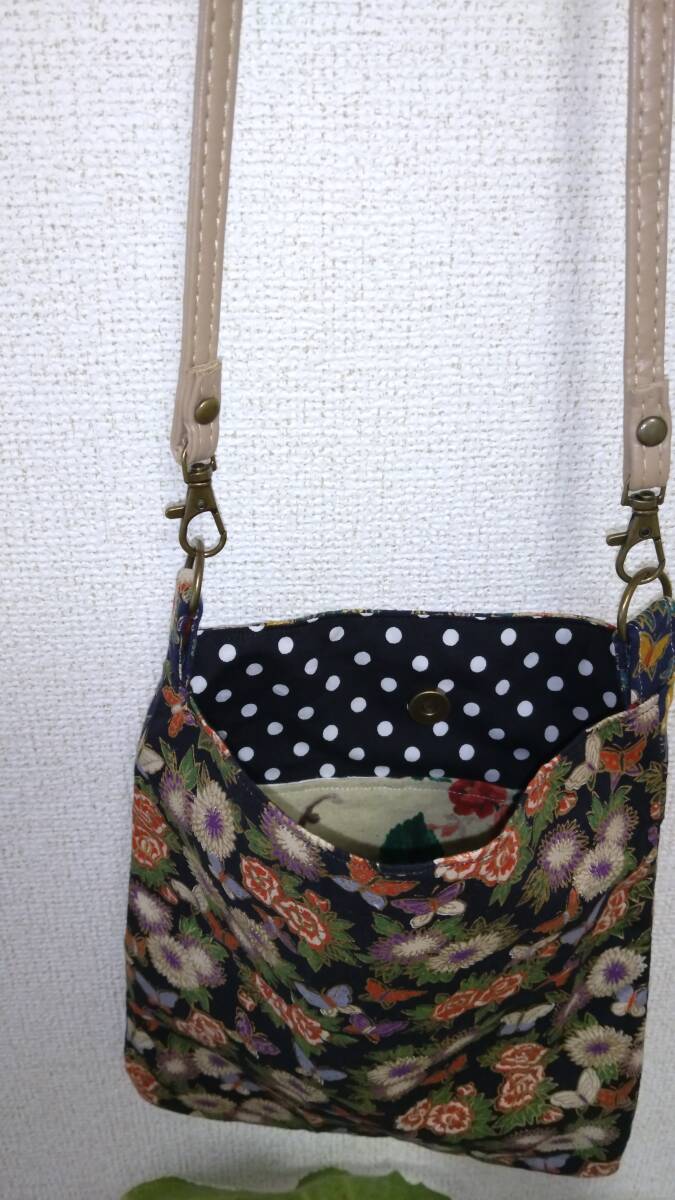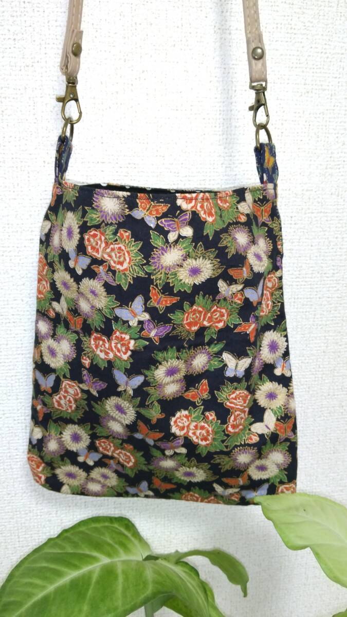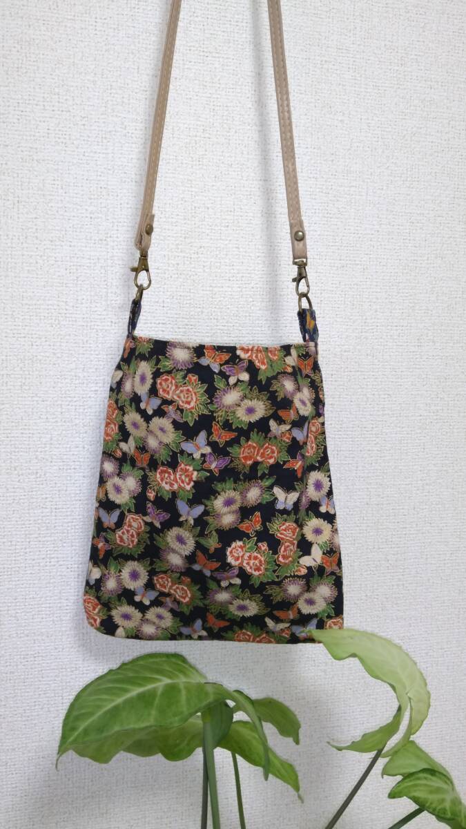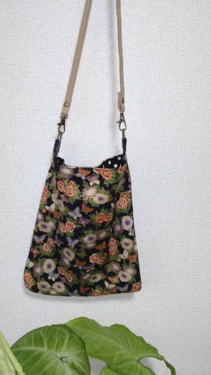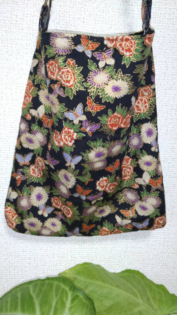 ハンドメイド・オンリーワンのバック・コットン和柄・黒地・菊・バラ・蝶々・ショルダー/斜め掛けバック