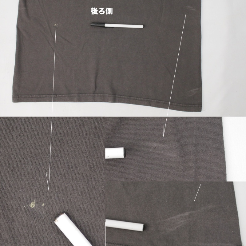 背中側、左腰に塗料シミ、右脇腹は、漂白なのか、擦れなのか、横線状に色ぶれ。
