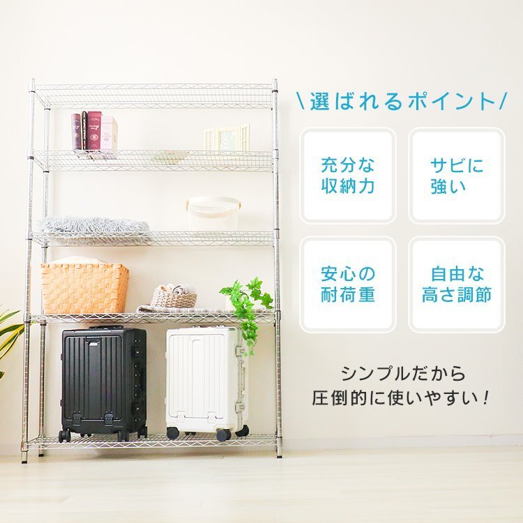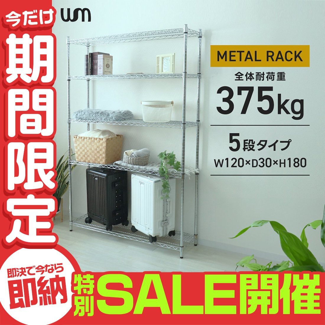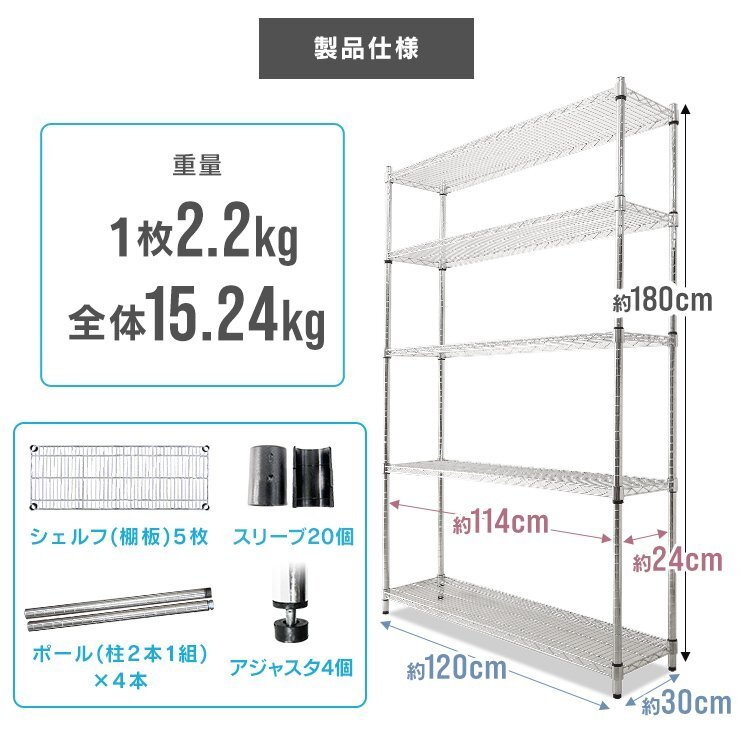 | どんなお部屋にも合わせやすいスチールラックです。 ぐらつき防止アジャスター付き! クギやネジを使わずに簡単に組み立て出来ます! 棚の高さを自由に変えることができます。 一人暮らしのお部屋やリビング、キッチン、物置など場所を問わず活躍できます。 アパレルショップの店頭用やオフィスにも使用されています。 【仕様】 サイズ(約):幅120×奥行30×高さ180cm 耐荷重(約):(全体)375kg / (棚板1枚あたり)75kg 材質:スチール(クロームメッキ)、ABS樹脂 他 重量(約):15.24kg 【商品内容】 シェルフ(棚板) ×5 ポール(ジョイント式) ×4 スリーブ ×20 アジャスター ×4 ※大型商品のため、特別中継料が適用されます。(北海道+1,100円/沖縄本島+2,200円/離島+2,200円) |