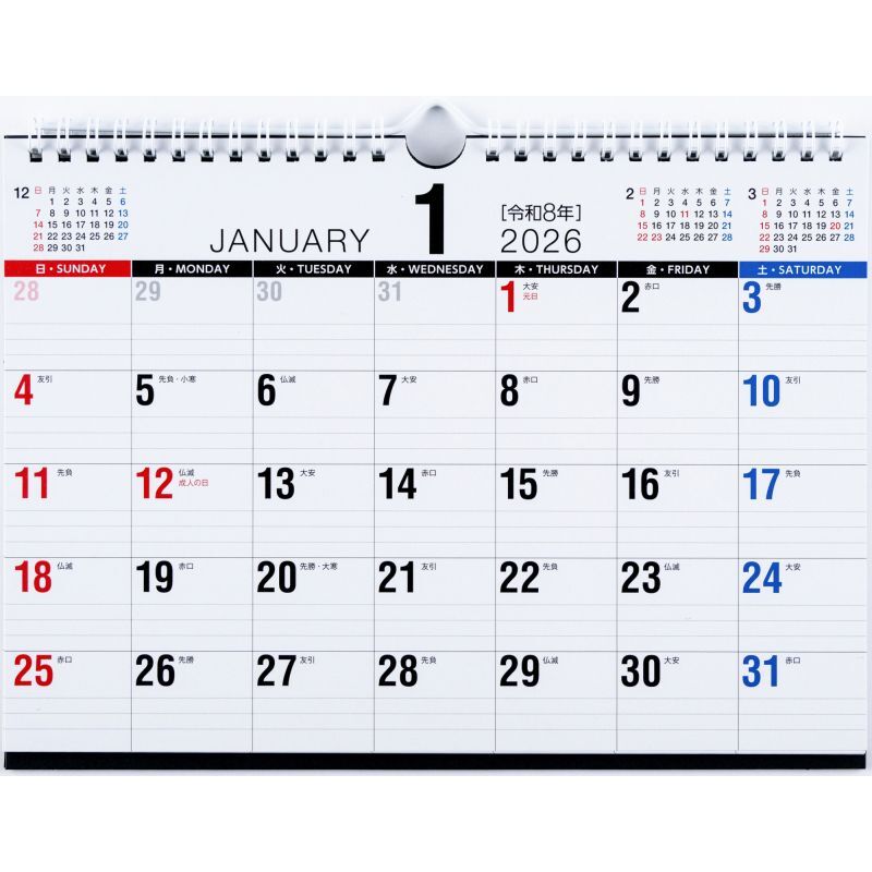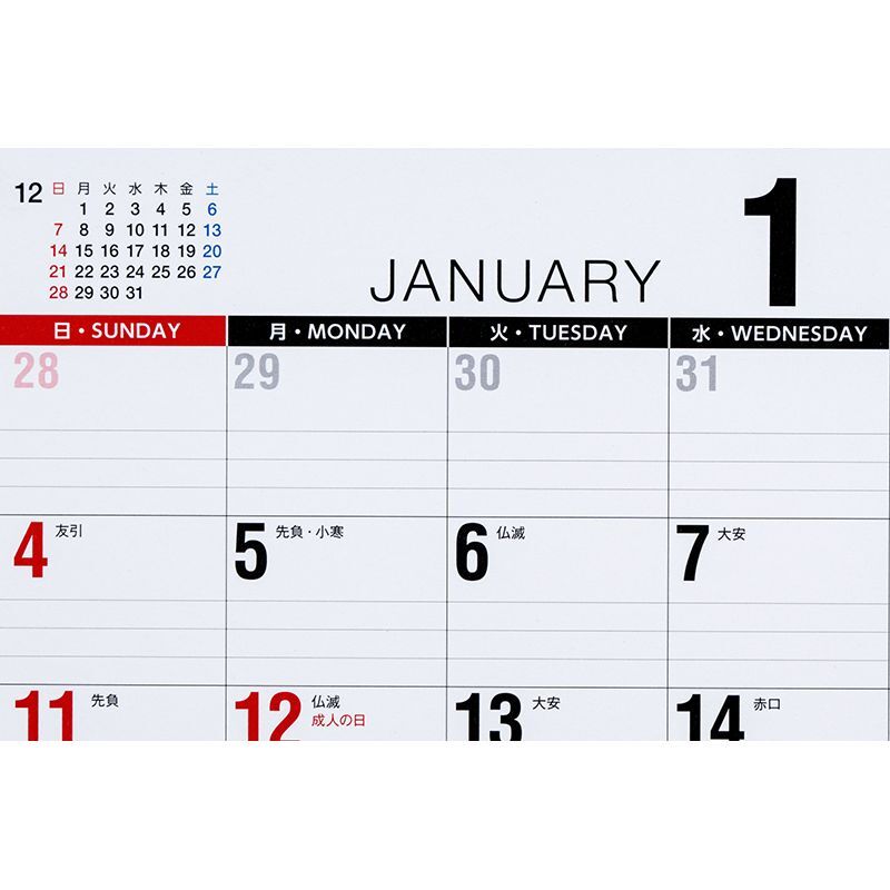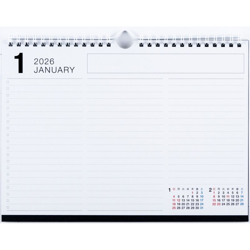 B5サイズのコンパクトな壁掛カレンダーとしても、大きめの卓上カレンダーとしてもお使いいただけます。裏面はフリーの横ケイメモスペースとTODOリスト付き。その月の備忘録などにご活用いただけます。エコで地球にやさしい、シンプルな壁掛・卓上兼用タイプのカレンダー[B5サイズ]