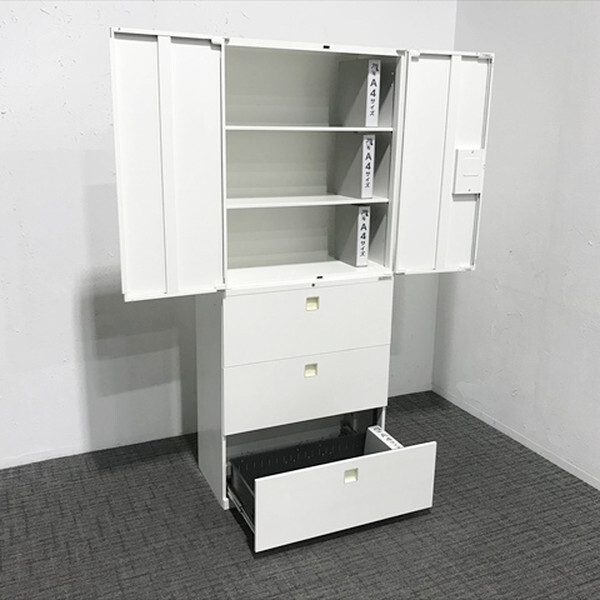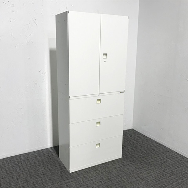 ■取り扱い番号 CU-876526B ■仕様 メーカー : オカムラ 製品名 : Rectline 色素材 : ネオホワイト 外寸 : 幅900mm 奥行き450mm 高さ2150mm ランク : Bランク ■特徴 上段:4B313Y ZA75 下段:4BG3ZC ZA75 ベース付 棚板2枚 上段は180°開閉可能で物の出し入れが容易です。下段は形や大きさが一定ではないものの収納にも便利です。 |