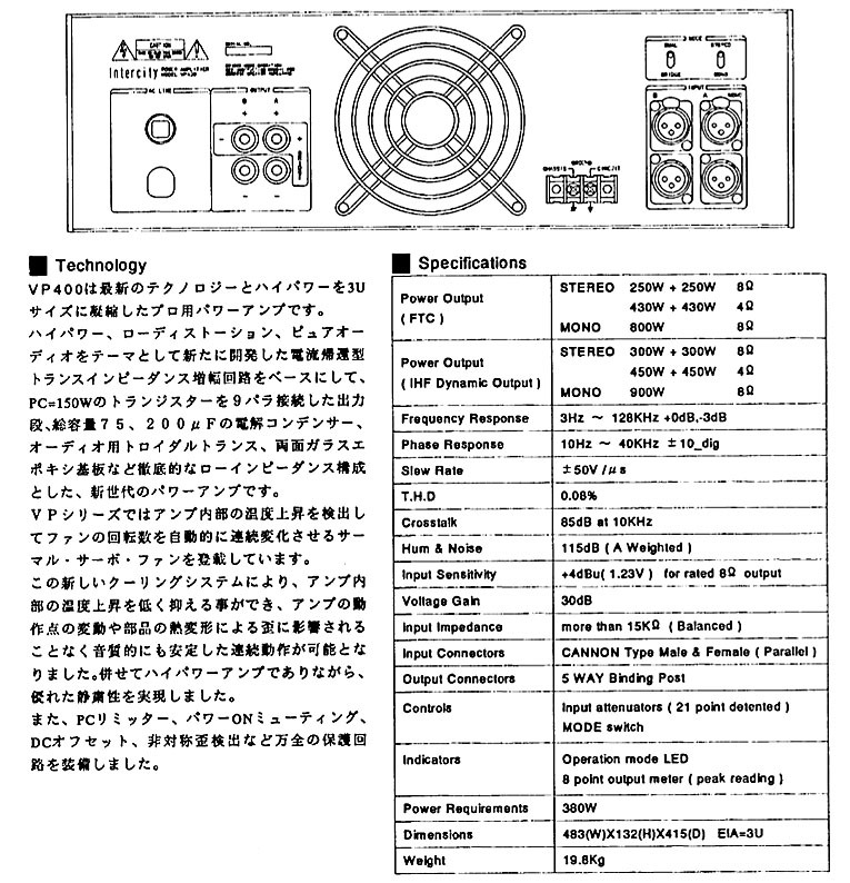 ご覧いただきありがとうございます。パワーアンプ IntercityインターシティVP400を出品いたします。