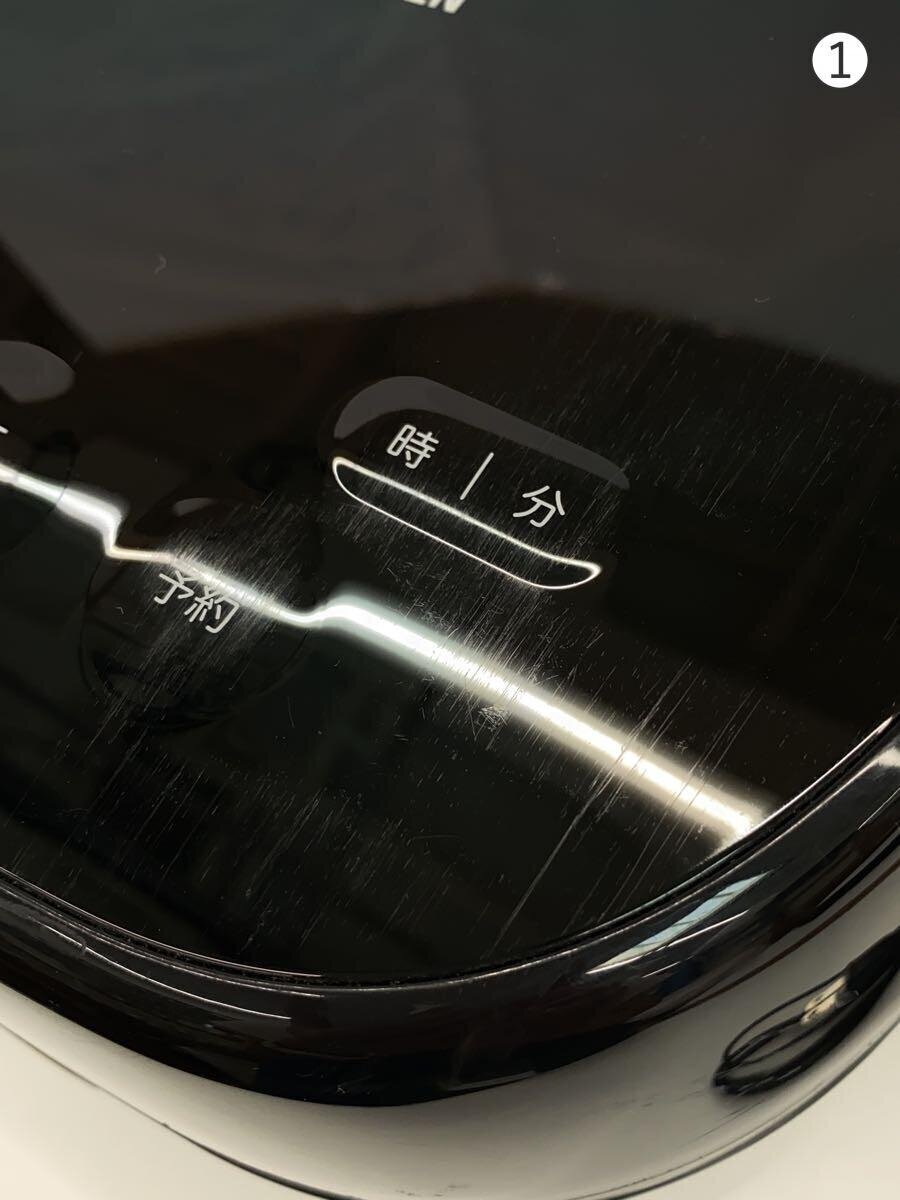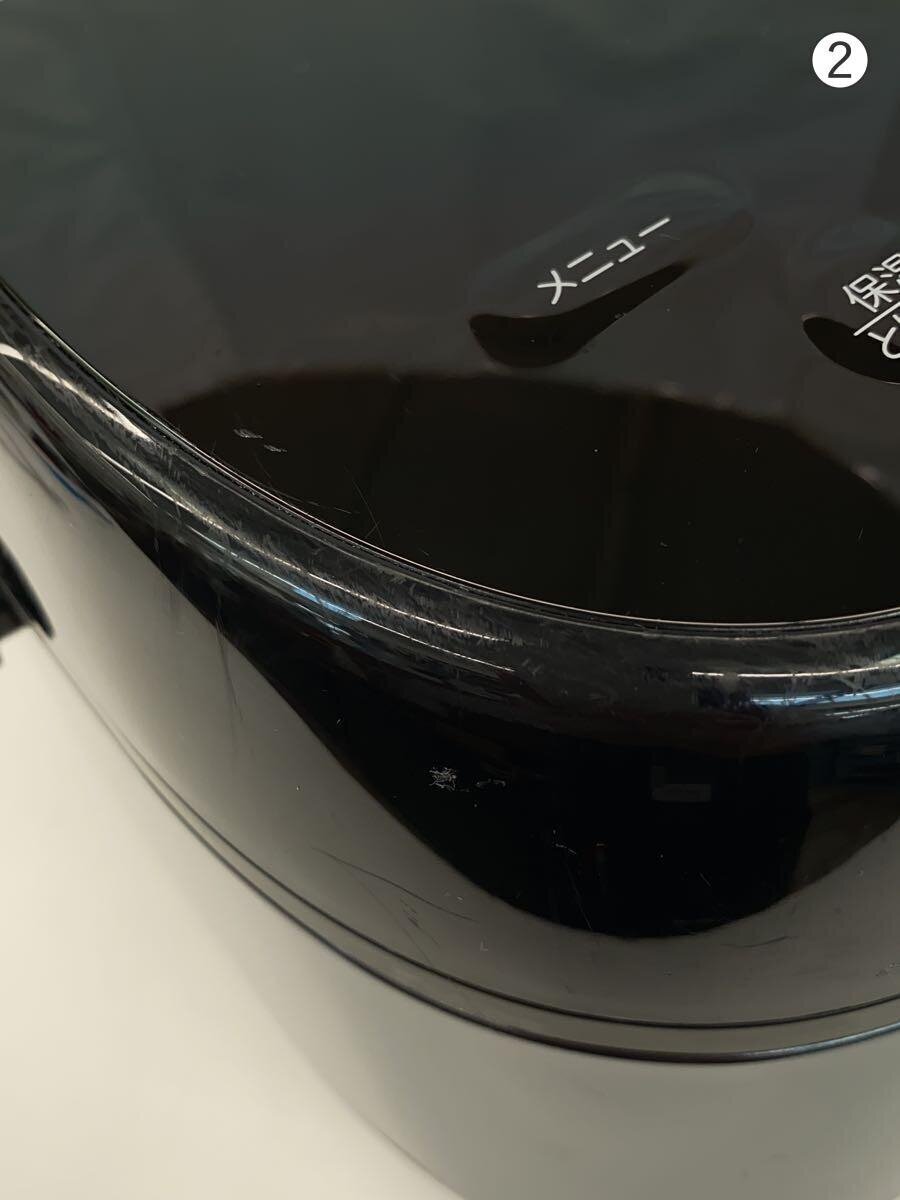 (1)上蓋部分に細かいキズが多数あり (2)上蓋角にキズあり 内釜に数ヶ所キズや剥がれあり |