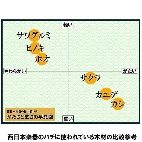 和太鼓奏者に実際に使用してもらい使いやすさを追求した西日本楽器オリジナルのヒノキ太鼓バチです。