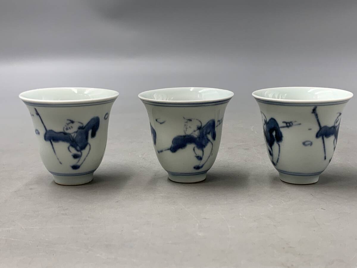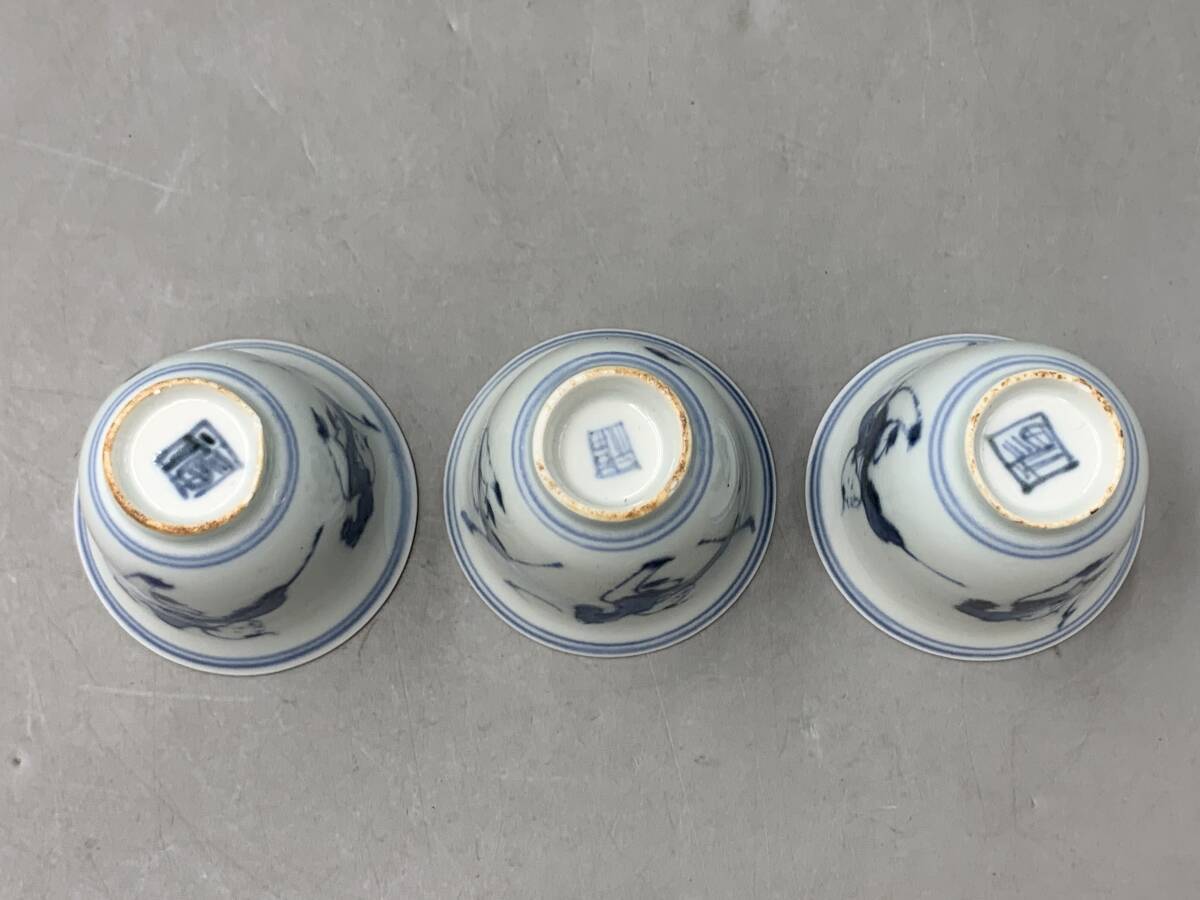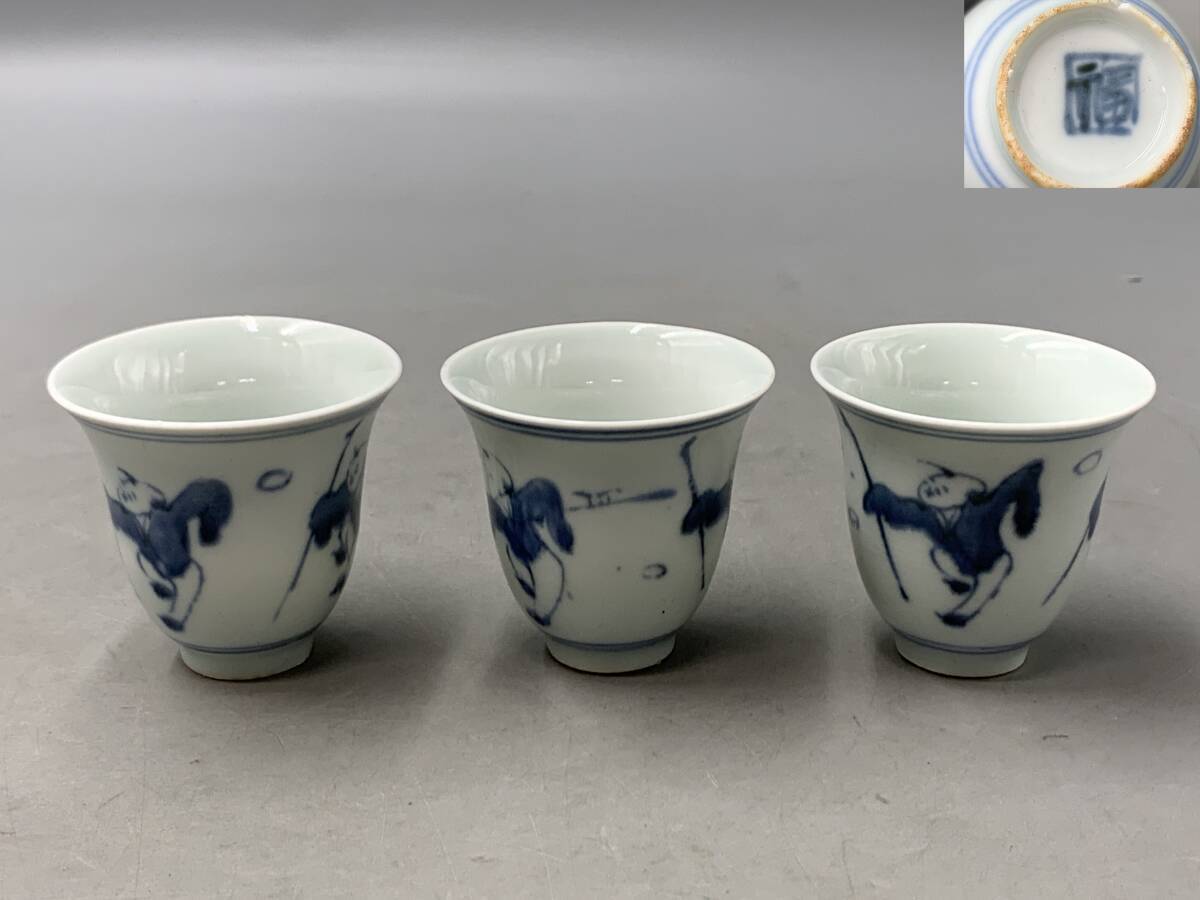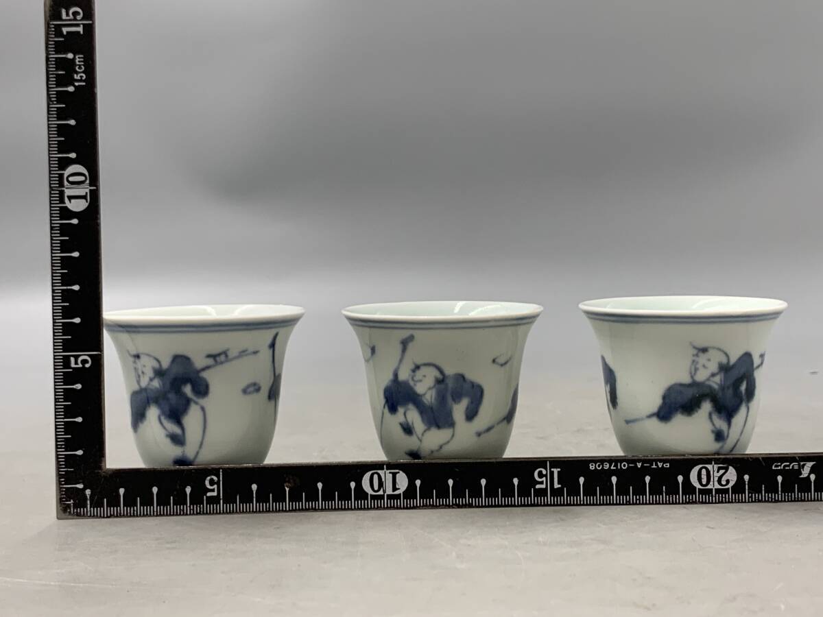 8#F/70149 染付 青華 唐子紋 杯 ぐい呑 茶器 福在銘 3客 煎茶道具 茶道具 60サイズ