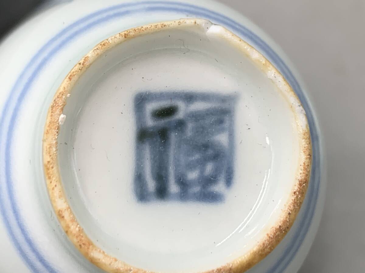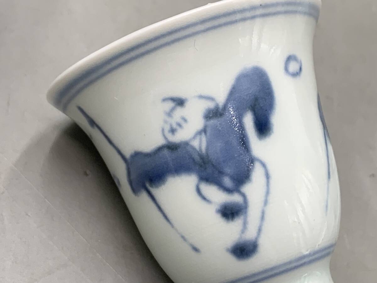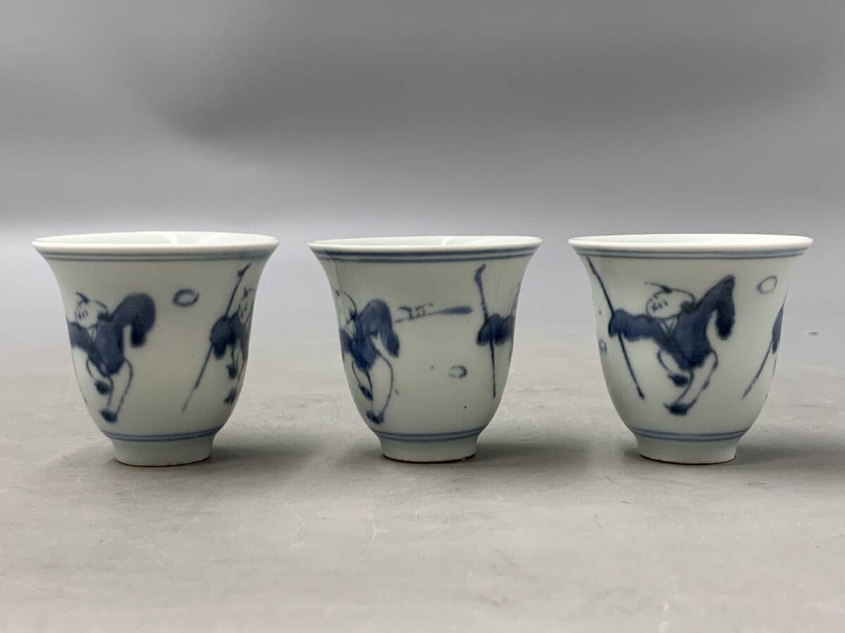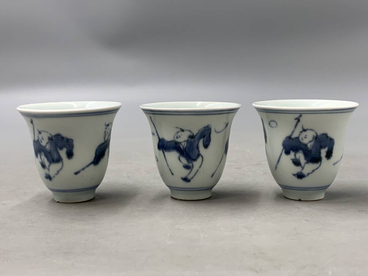 8#F/70149 染付 青華 唐子紋 杯 ぐい呑 茶器 福在銘 3客 煎茶道具 茶道具 60サイズ