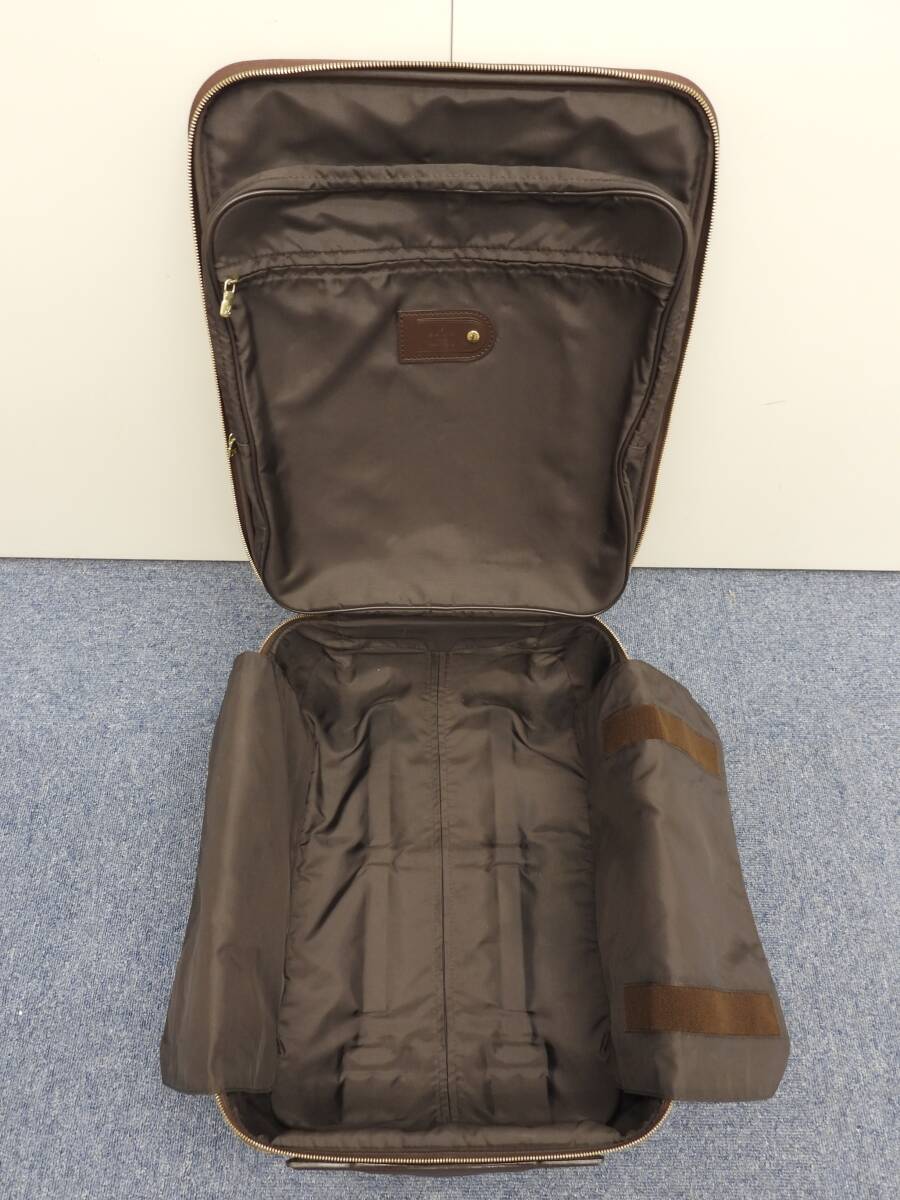 : ボディはスレ・汚れもなく綺麗です。底部角に薄スレ・薄汚れが少しございます。ハンドルは薄スレ・薄汚れが少しございますが、弱りもなく状態は良いです。収納可能なキャリーグリップは薄スレが少しございますが、弱りもなく状態は良いです。ローラーは直営店で新品に交換済みで綺麗です。バッグ内は薄汚れが少しございますが、目立つダメージはございません。ファスナーの開閉はかためです。金具部分はスレ・メッキ剥げが全体的にございます。