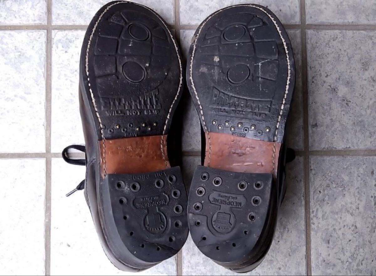 ソールの減り、歩行に問題はありませんがハーフソールの化粧釘が何本か取れています(写真6枚目)