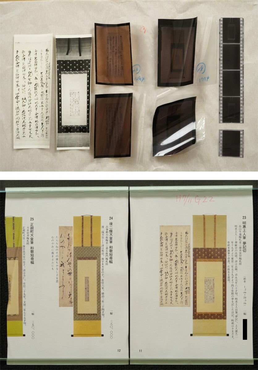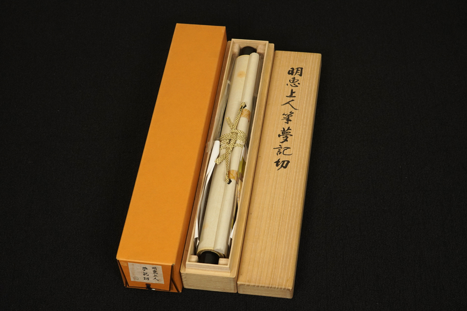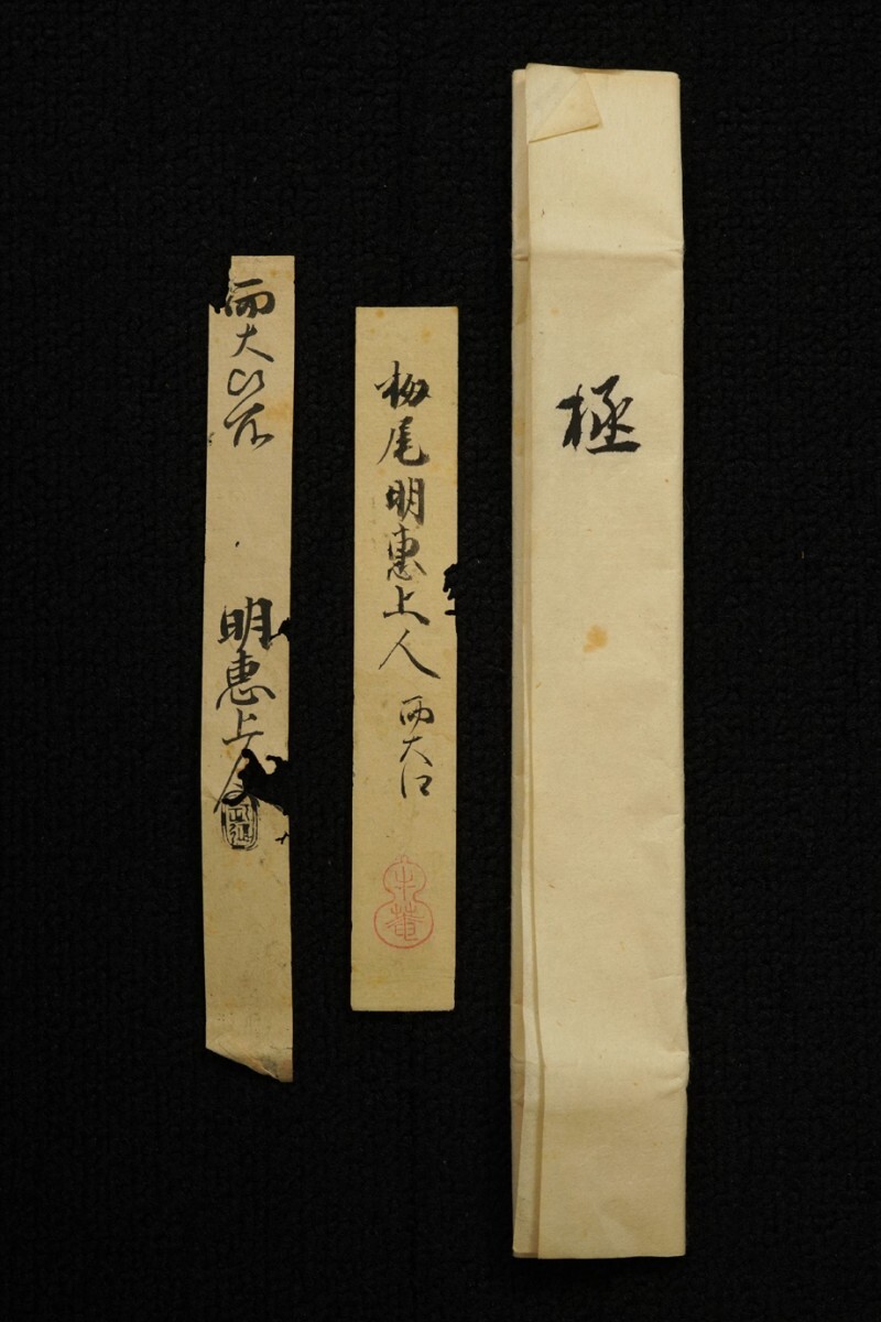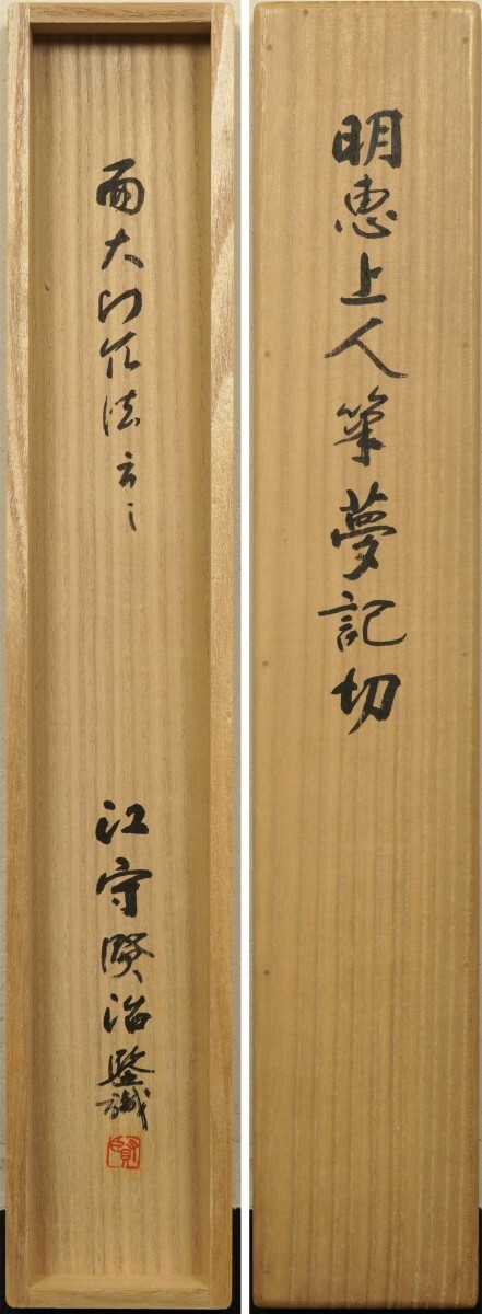 総丈サイズ…横 38 × 縦 138 cm 紙本・箱入 江守賢治箱書 畠山牛庵並藤井常智極 状態…少シミ 【印刷ではありません】 【真作】 明恵上人 鎌倉前期の華厳宗の僧。紀伊生。姓は伊藤、諱は成弁、のち高弁。明恵上人・栂尾上人とも呼ばれる。父は平重国。母は湯浅宗重の四女。幼くして父母を失い、高雄山神護寺の文覚について出家。のち東大寺で華厳を学ぶ。建永元年後鳥羽上皇より栂尾山を賜わり、高山寺を創建して華厳宗興隆の道場とした。著書に『摧邪輪』など。貞永元年(1232)寂、60歳。 畠山牛庵 江戸時代に活躍した古筆鑑定家。 藤井常智 江戸時代初期の古筆鑑定家・古筆了佐の門人。生没年未詳。 |
