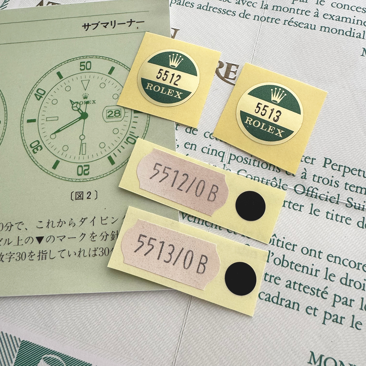 ロレックス、サブマリーナのリファレンスシール4点セットです。5512 と 5513です。末尾の0はステンレスモデルの品番になります。もう一方のBは不明ですが、もしかしたら国表記かと思われます。また同じモデルでも年代によって表記揺れがあります。